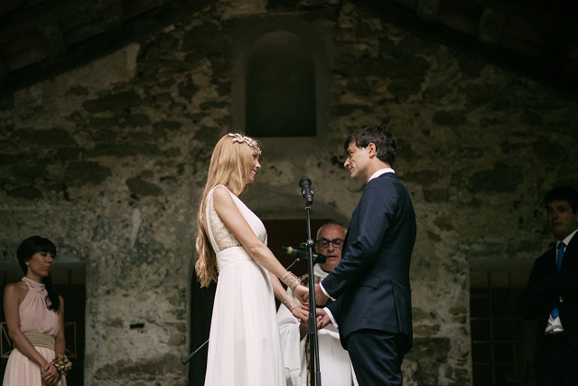 La ceremonia tuvo lugar una pequeña ermita en mitad del bosque, Sant Martí del Corb. El novio entró junto a los padrinos al ritmo de la música y Erika del brazo de su padre, y de Senna.