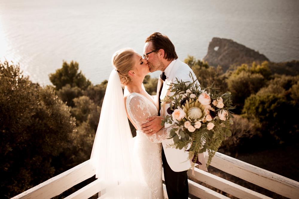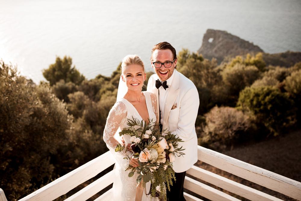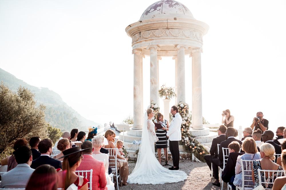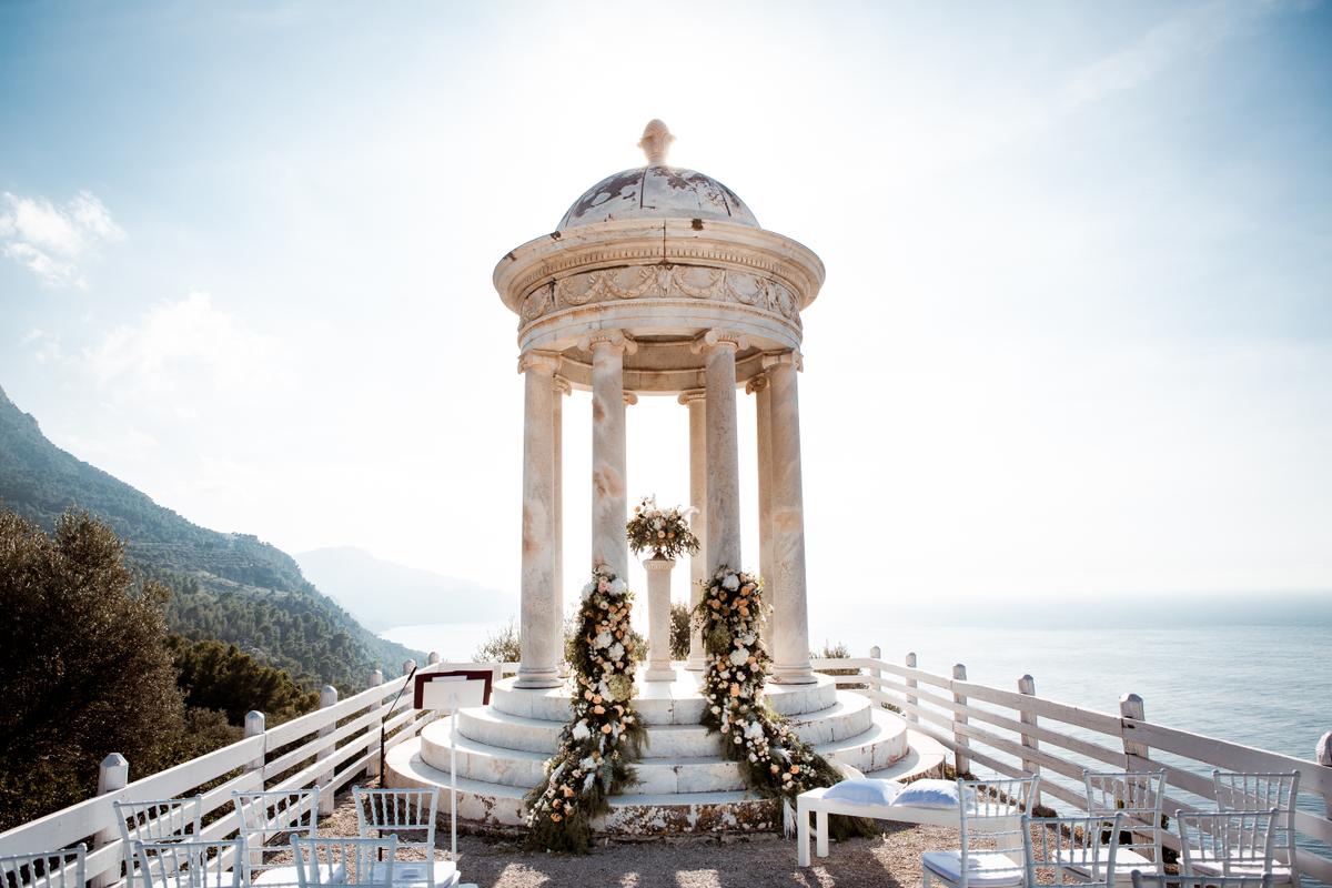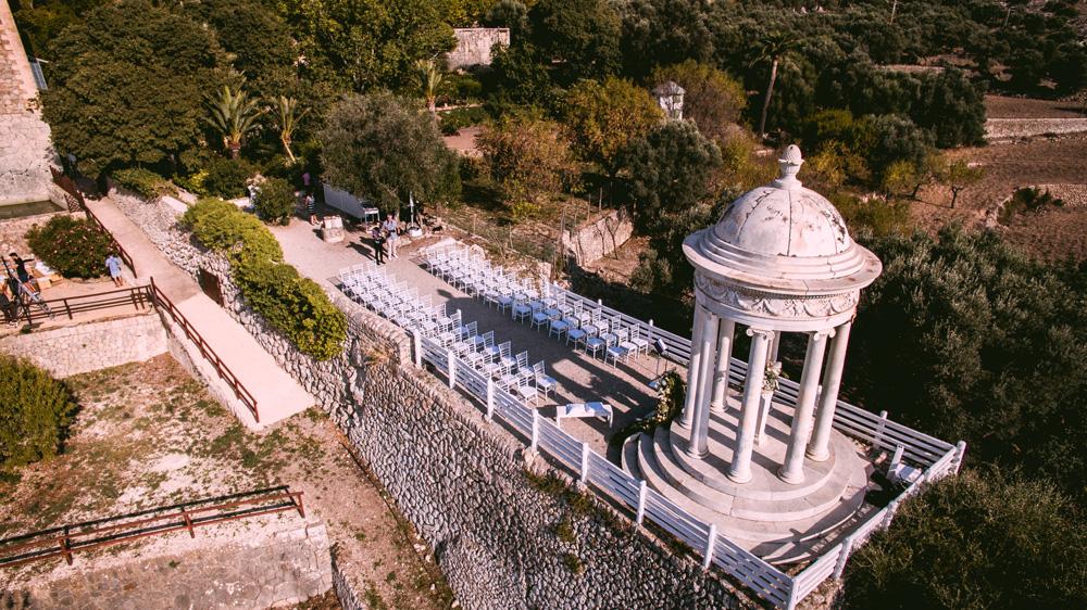 A la llegada, los invitados fueron recibidos con una estación de limonada y cervecitas para hacer más fácil la espera de la novia. Antes de la llegada de la novia y sus damas de honor los invitados y el novio pasaron a la zona de la ceremonia. Preparada con mucho cariño por nuestro equipo de decoración y floral con unas imponentes columnas florales y de fondo Sa Foradada.