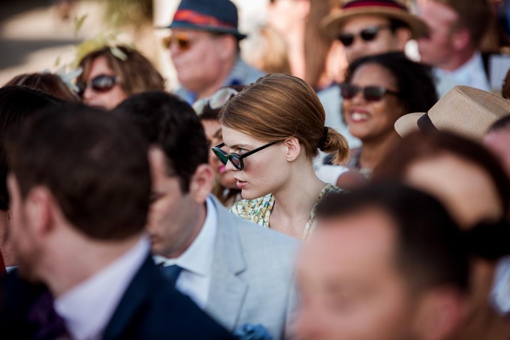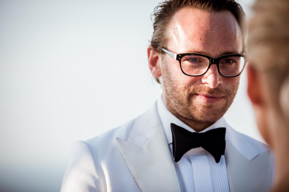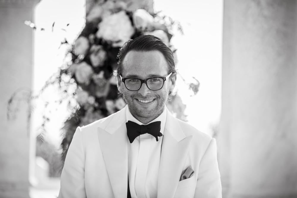 El novio, esperaba en el altar vestido de Thom Sweeney y zapatos de Crockett & Jones. Los gemelos de nácar que combinaban con las gafas de Tom Davies fueron un regalo de Nicola.