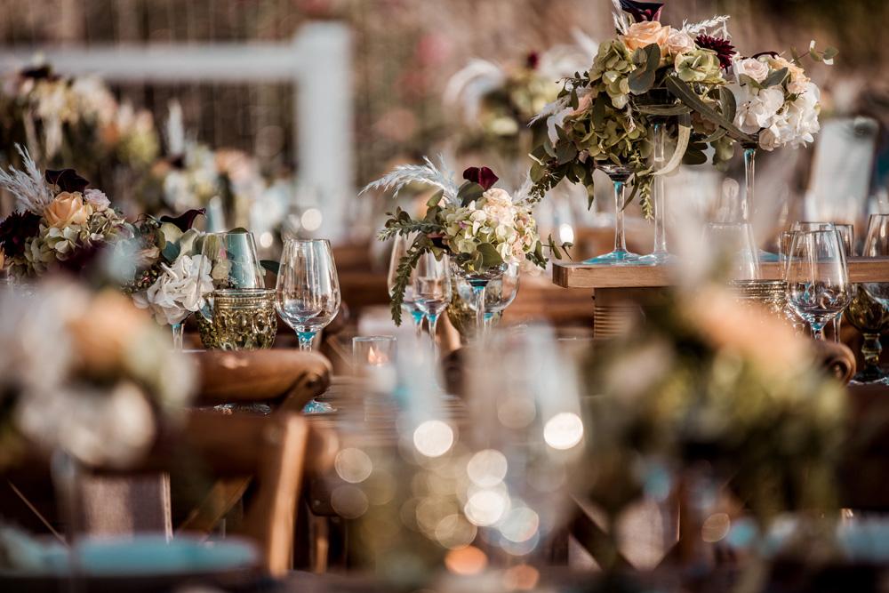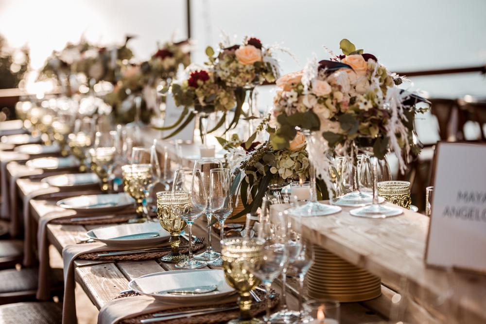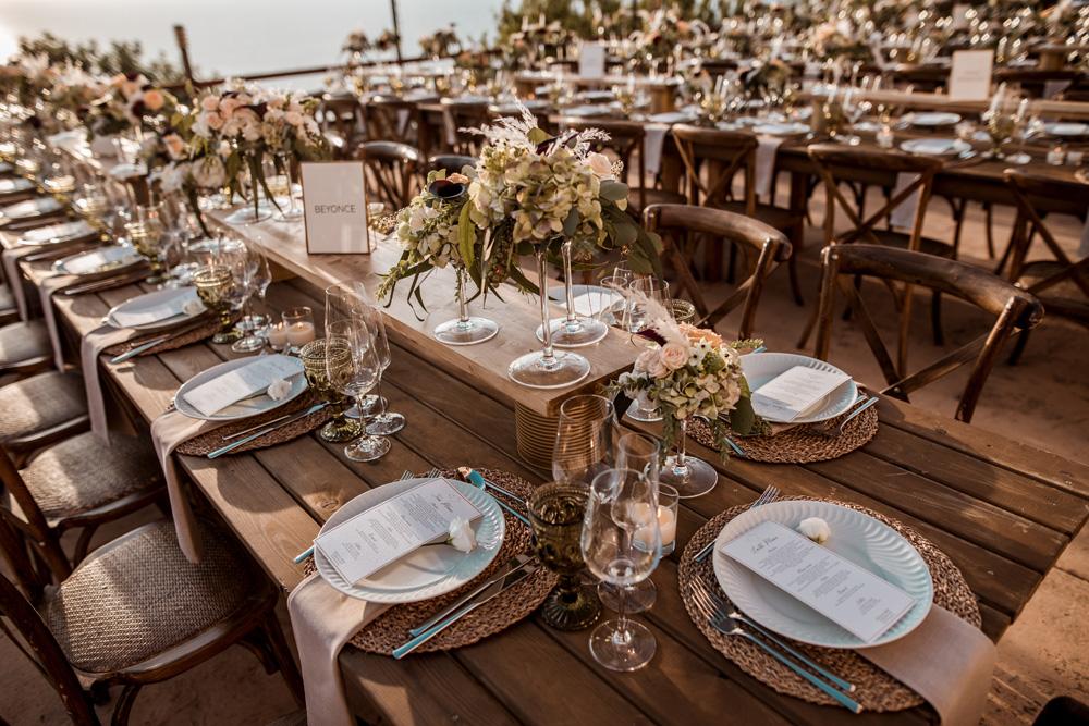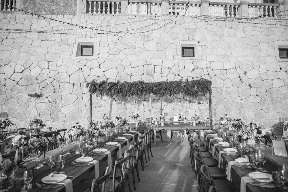 La cena tuvo lugar en la hermosa terraza bajo la fachada de la finca donde dispusieron mesas alargadas de madera con una decoración exquisita. Para dar el toque especial se crearon unas estructuras de madera y dorado para poder disponer de más espacio para el floral y servir el manjar a compartir del fabuloso catering The Cutting Edge.