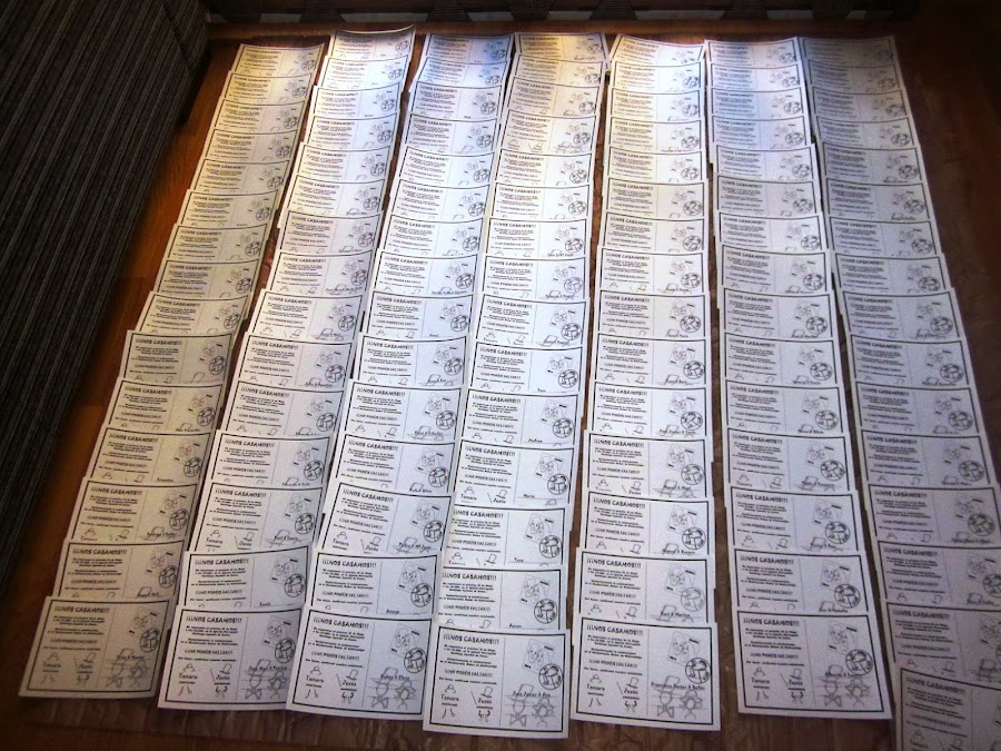 6. Como no quería escribir el nombre de los invitados a mano (me daba la sensación de que estropeaba la invitación), realicé pdf´s de cada invitación a entregar, así luego imprimía una tras otra. Todos los textos están redactados con las fuentes "Snap ITC" y "Jokerman".