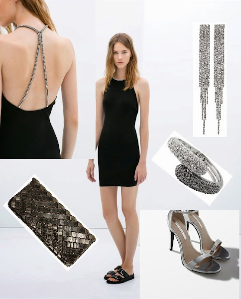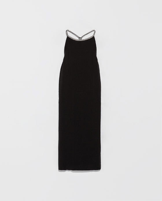 Vestido negro ajustado de Zara, con tirantes joya en color plateado y escote en la espalda: precio 39,95 euros.