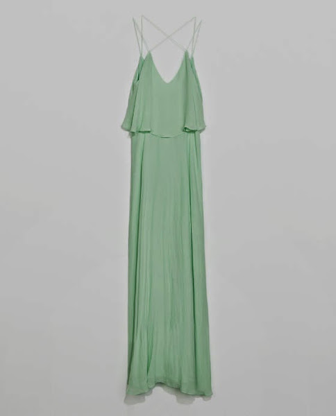 Vestido largo color verde menta con falda y escote en dos capas, espalda descubierta y cruzada. De Zara. Precio: 49,95 euros.