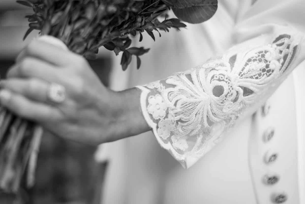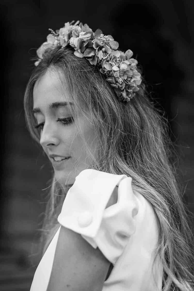 Y para dar vida a esta novia decidimos optar por un maquillaje suave y un peinado con ondas rotas que realizó Amaia Lauzirika. Quisimos jugar con elementos románticos como las hortensias preservadas para la diadema y el ramo, que fueron un diseño de Daniela de Dilo con una flor con ese toque vintage que tanto nos gusta. Para las joyas, no tuvimos ninguna duda, queríamos jugar con ese algo azul y le pusimos unos pendientes y un anillo de nuestra colección de Navas Joyeros con aguamarinas y para romper un poco el look unas sandalias con taconazo de Ives Saint Laurent en color berenjena.