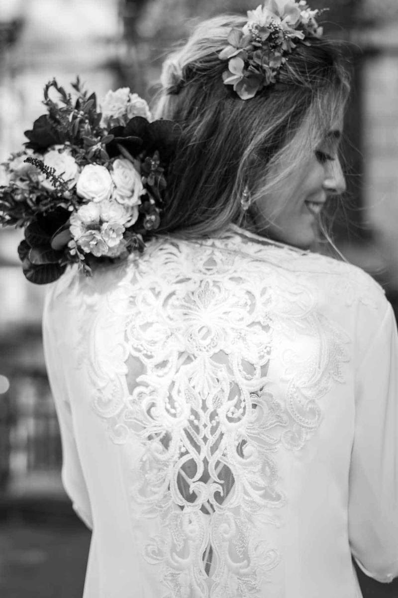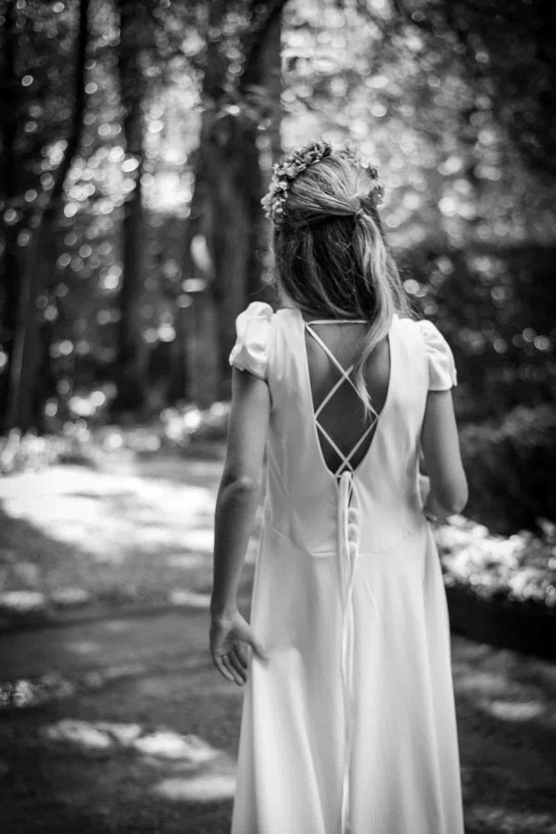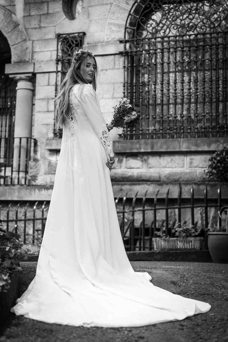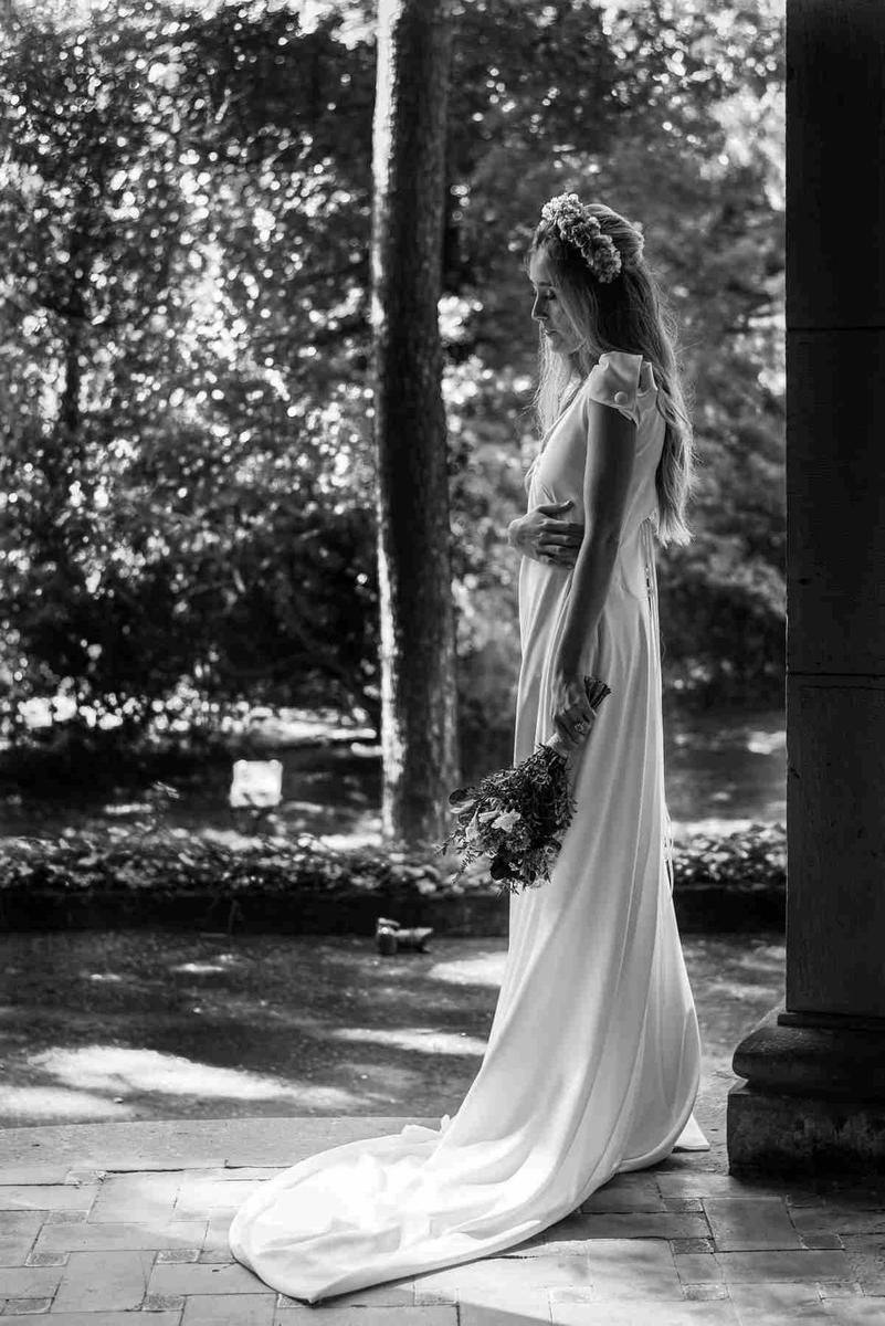 Os presentamos a una novia con el detalle de la espalda cruzada, un vestido de novia que Miguel diseñó para esta sesión de fotos.