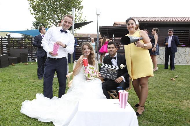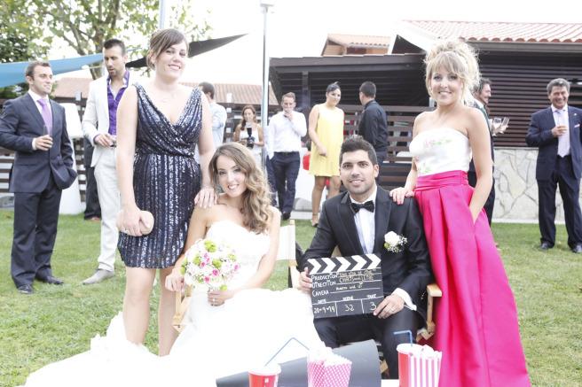 Las amigas de Leyre, Nerea y Leire, decidieron hacerles un video gracioso con connotaciones de la vida de ambos. Para ello, prepararon una escena como si de dos actores se tratara. Sillas con sus nombres y palomitas incluidas. Esto si que es una gran sorpresa!! Hasta el momento, no lo había visto, y tengo que deciros chicas, que me encantó! Que pena no tener una foto de los novios del momento en el que se encontraron con el cortometraje de su vida!!