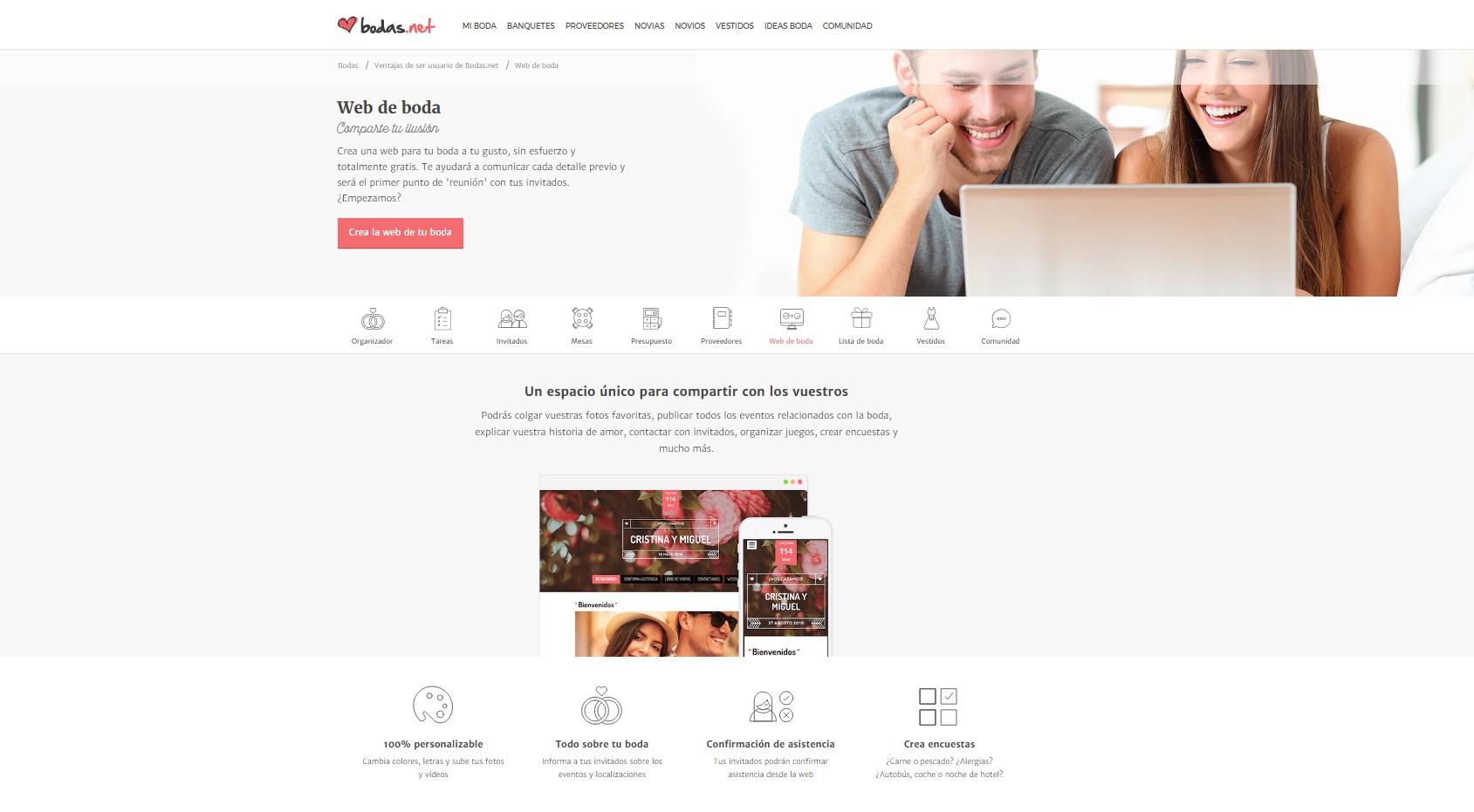 En esta ocasión os hablo de una página web personalizada y configurable tanto en su aspecto (colores, tipos de letra, diseño) como en contenidos (textos, imágenes, vídeos) para que los novios puedan interactuar con los invitados, facilitando toda la información sobre la Boda (lugares, mapa, teléfonos contacto...), u otras informaciones como número de cuenta para el regalos lista de bodas, donde además los invitados podrán localizarse para confirmar su asistencia y detalles como si tienen alergias alimentaria y donde también podrá crear encuestas sobre los platos o el medio de transporte.