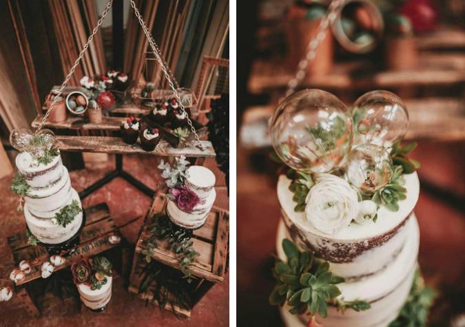 En esta segunda parte de la editorial vemos a la pareja más acaramelada porque ya han pasado los nervios de la ceremonia y para acompañar una atmósfera tan festiva contaron con un rincón dulce espectacular. En él encontramos antiguas cajas de madera y stands hechos con palés en los que se dispusieron las delicias dulces que prepararon en Aquarela Cakes. Siguiendo la temática industrial encontramos semi naked cakes coronadas con suculentas y delicadas bombillas de cristal, macarons en tonos esmeralda decorados con pinceladas de brillante cobre, muffins con frutos rojos y muchos detalles en cálidos dorados.