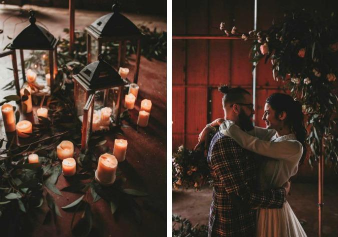 Escogieron un estilo industrial para arrojar un poco de luz sobre una tendencia tan absoluta que está muy poco explorada en Sevilla. La sesión se celebró en el taller creativo Tejares 11 y se rodearon de muchos colores para conseguir la calidez de ese romanticismo decadente que protagonizó al elopement, desde tonos verdes y vinos en la decoración y los estilismos de la pareja hasta los metales y hormigón de los instrumentos de la fábrica que los acompañaron en todo momento. El altar, creado con cañerías de cobre por La Buganvilla, estaba enmarcado por verdes naturales y flores en tonos rosas y marsalas para crear un poco de contraste. A su alrededor se dispusieron pequeñas velas y un pasillo creado con sillas de tapizado antiguo que encuadró la ceremonia.
