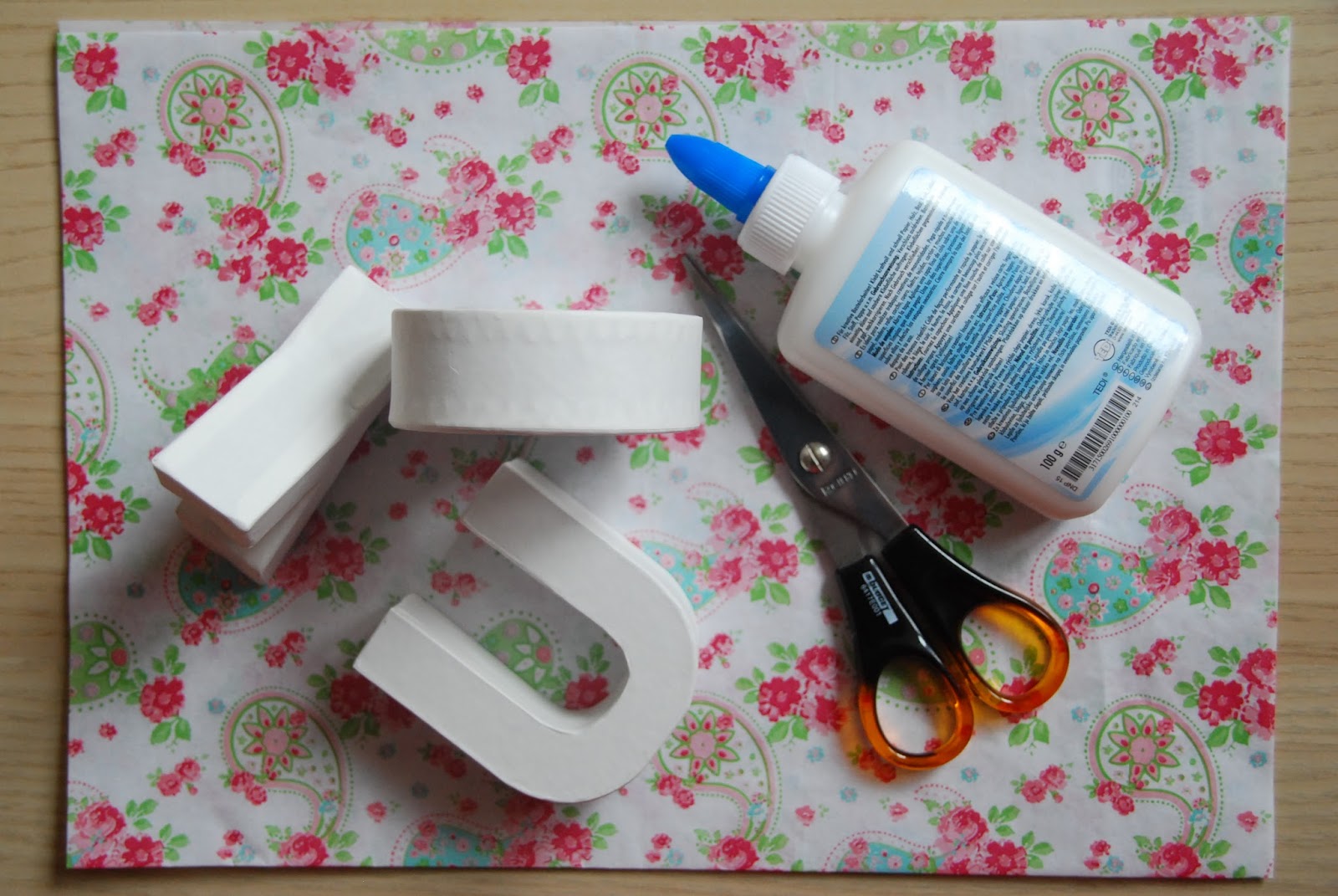 Materiales: Para hacer vuestras letras de cartón forradas, vais a necesitar; un pliego de papel de seda (según el tamaño de las letras), tijeras, cola blanca, letras de cartón o pape maché.