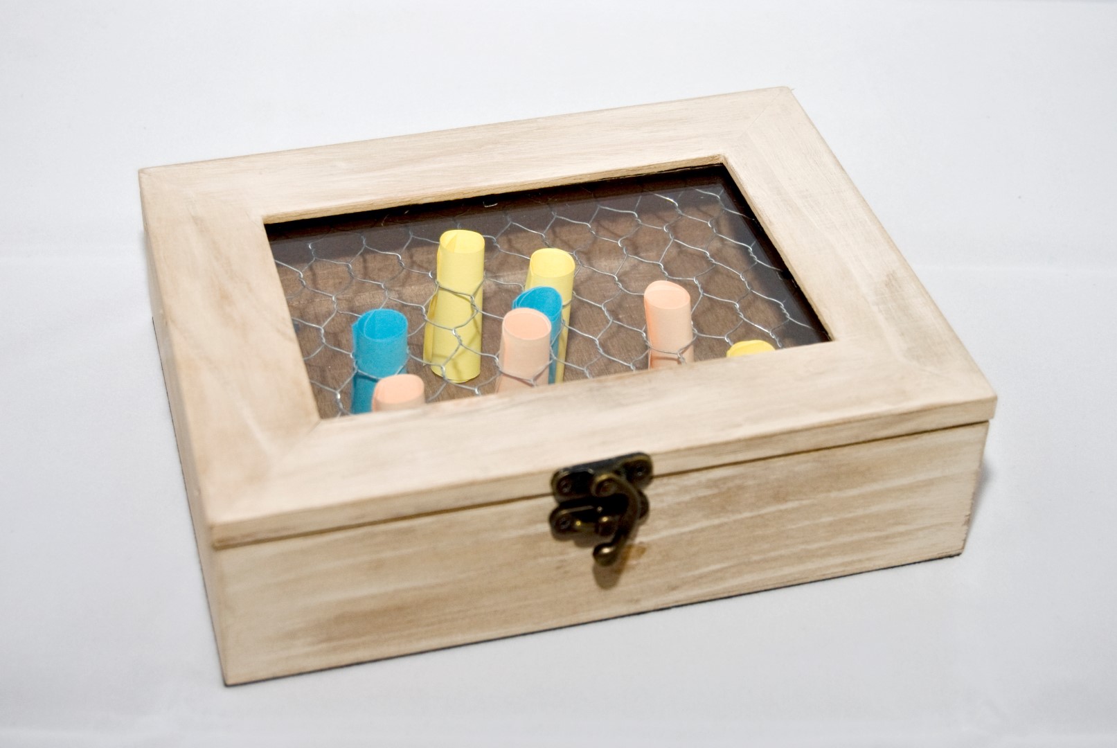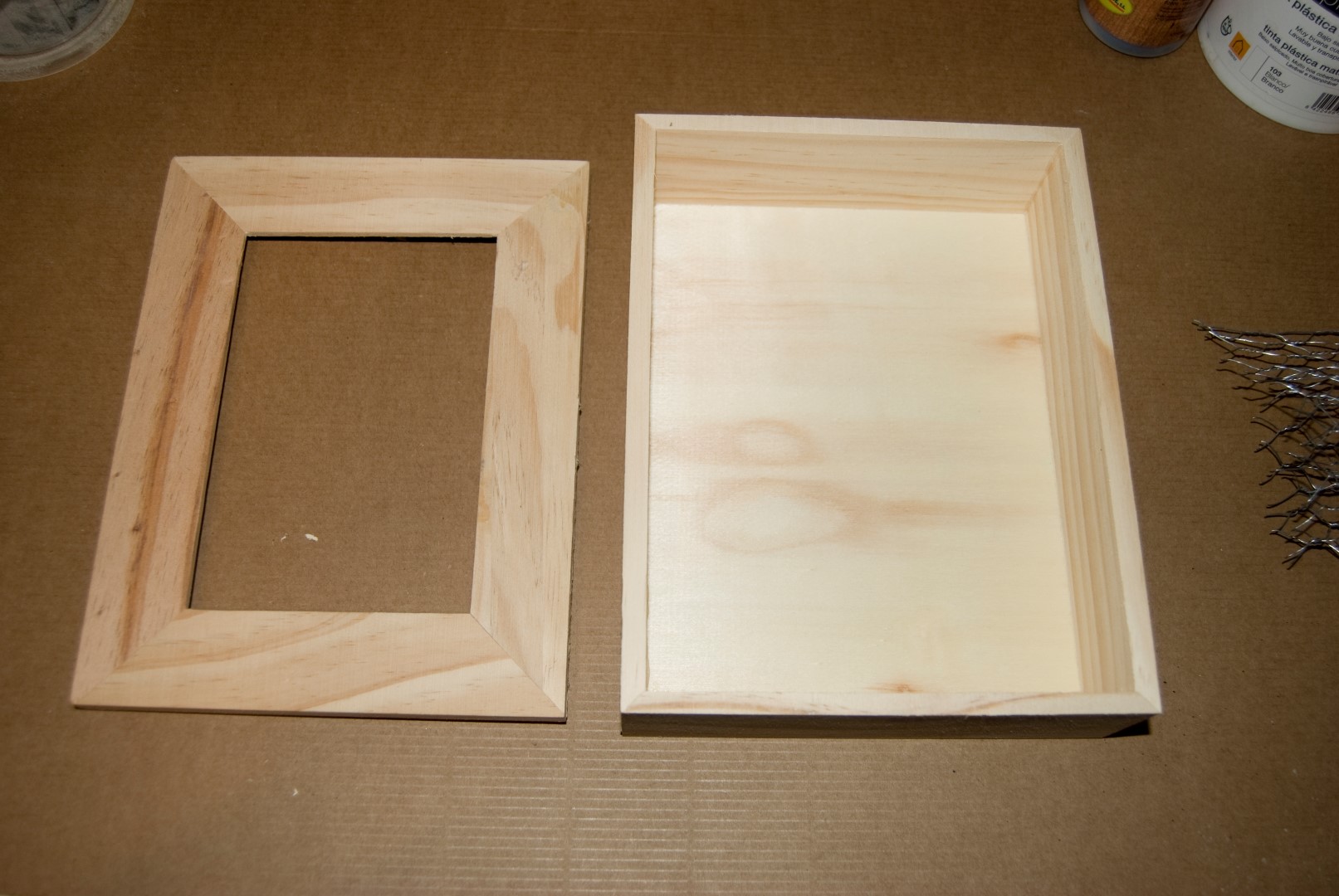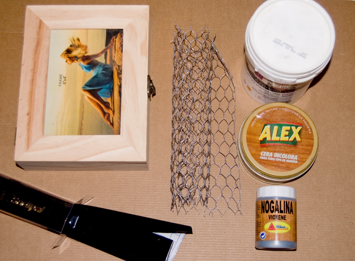 - Una caja de madera sin pintar con cristal en la tapadera. Las podéis encontrar en tiendas de bricolaje, de manualidades o bazares de barrio.