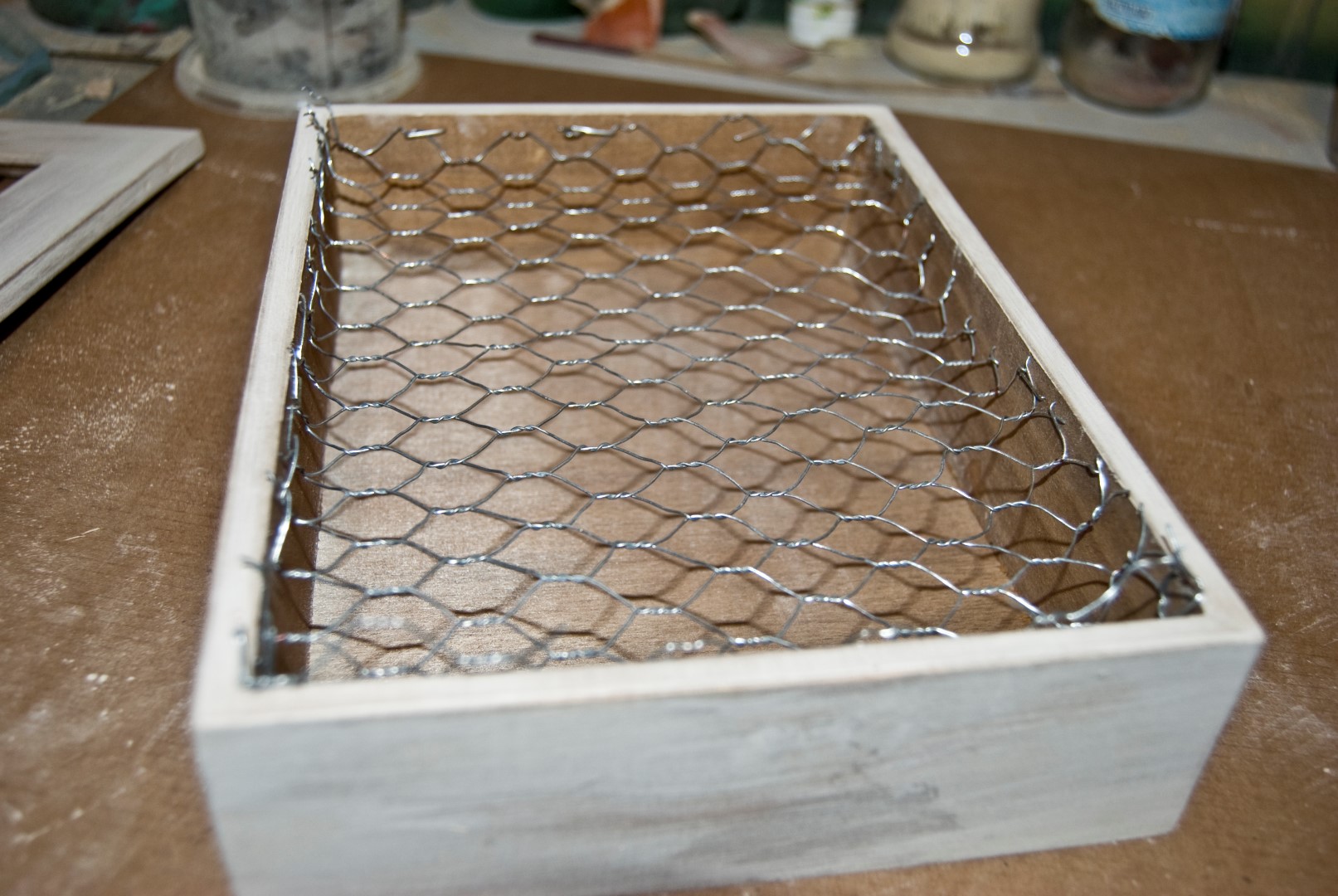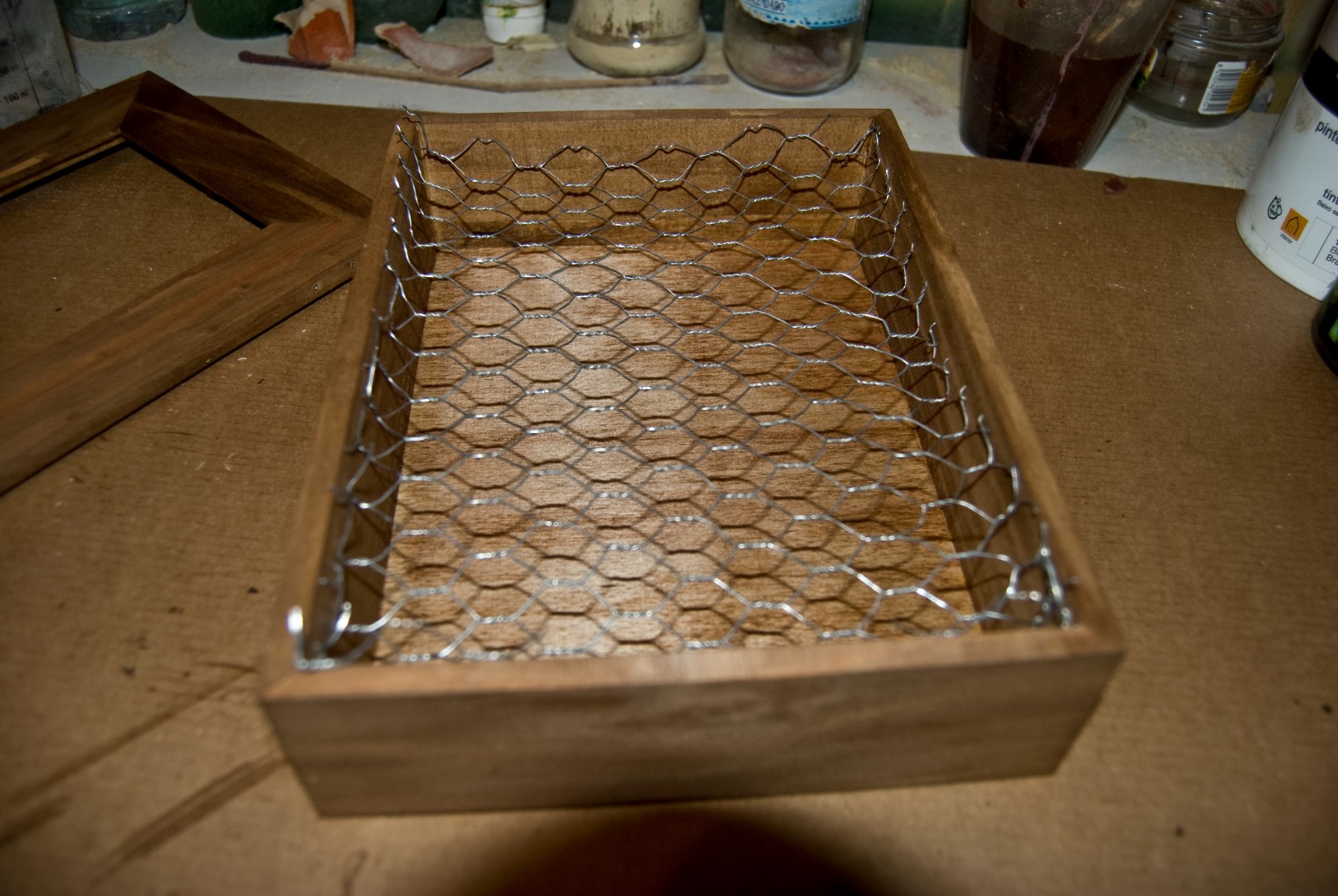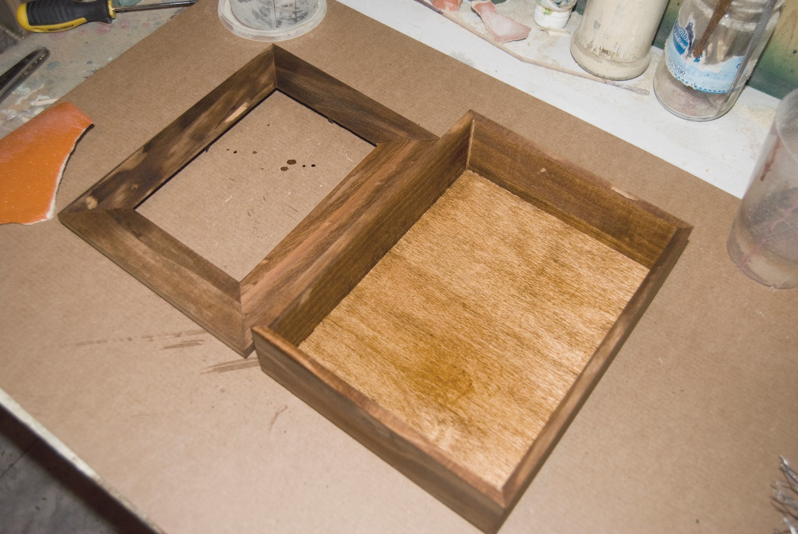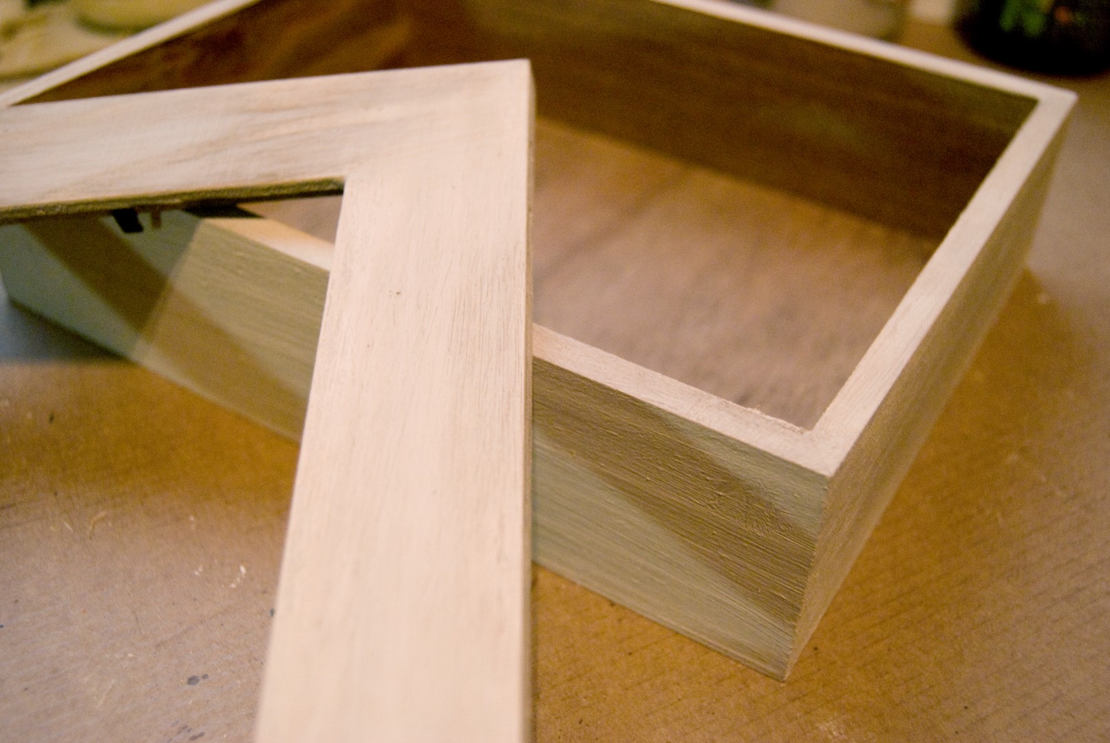 - Una caja de madera sin pintar con cristal en la tapadera. Las podéis encontrar en tiendas de bricolaje, de manualidades o bazares de barrio.