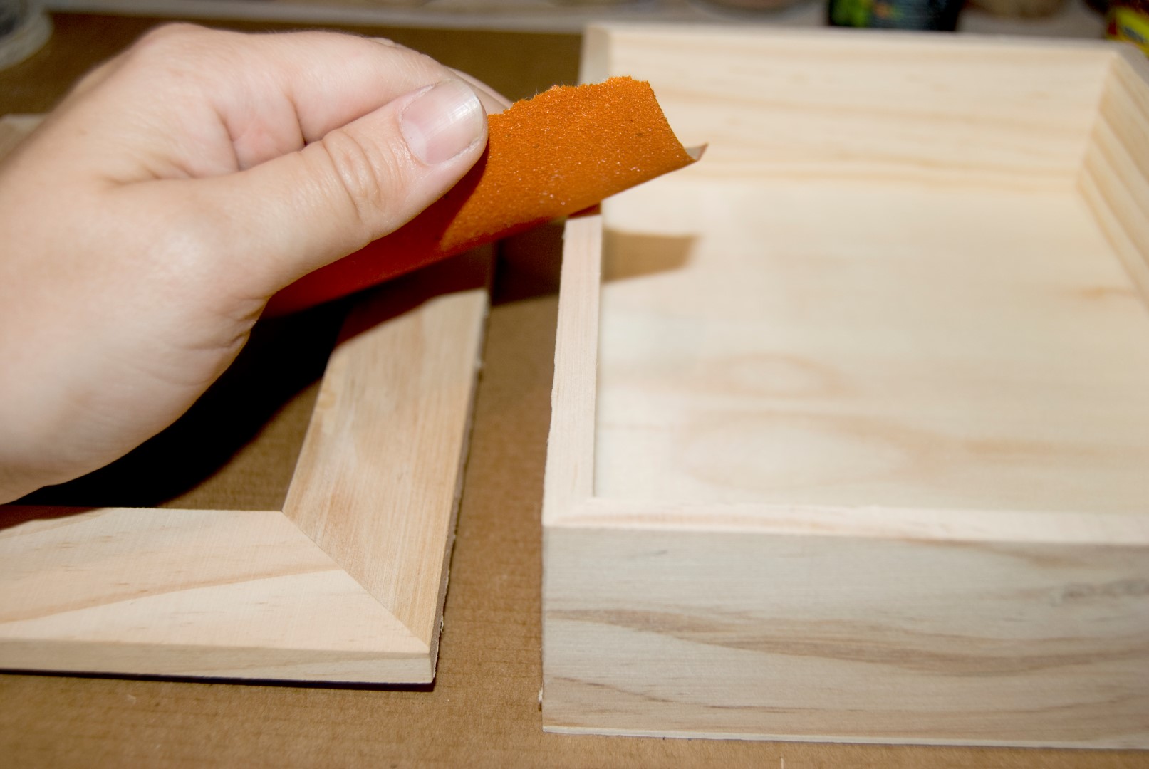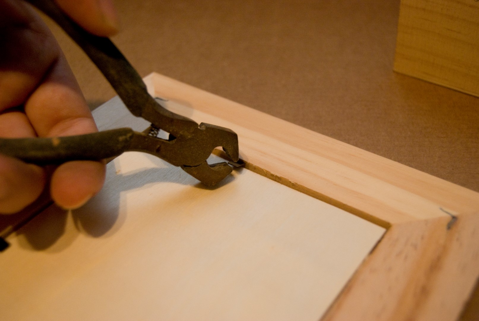 Antes de seguir, comprobamos que la pieza que acabamos de cortar encaja en la caja de madera. La quitamos para seguir trabajando.