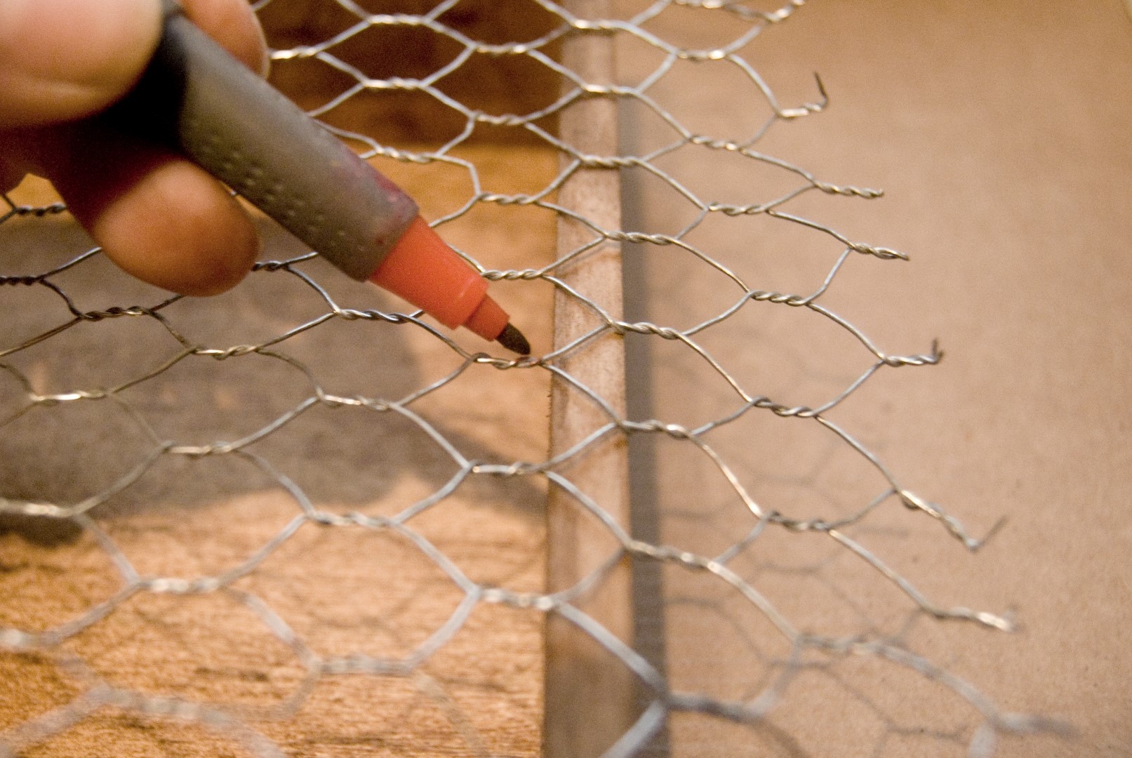 Para tomar la medida a la que tenemos que cortar la rejilla, ponemos el trozo de rejilla sobre la caja y marcamos con un rotulador permanente el borde interior de la caja.