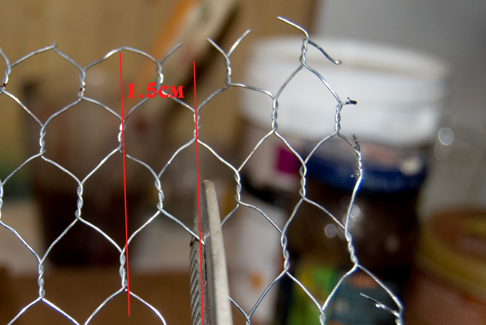 Con unas tijeras o alicates (Depende del grosor del alambre) cortamos la rejilla aproximadamente 1.5 cm por el exterior de las marcas que hemos hecho.