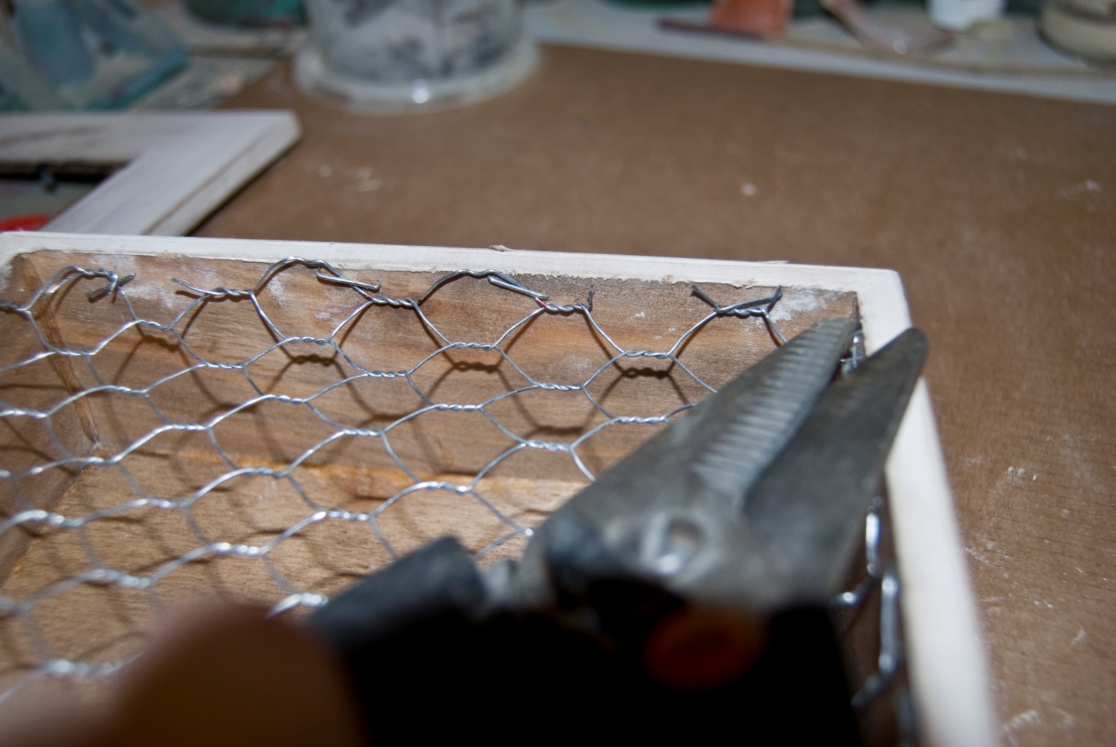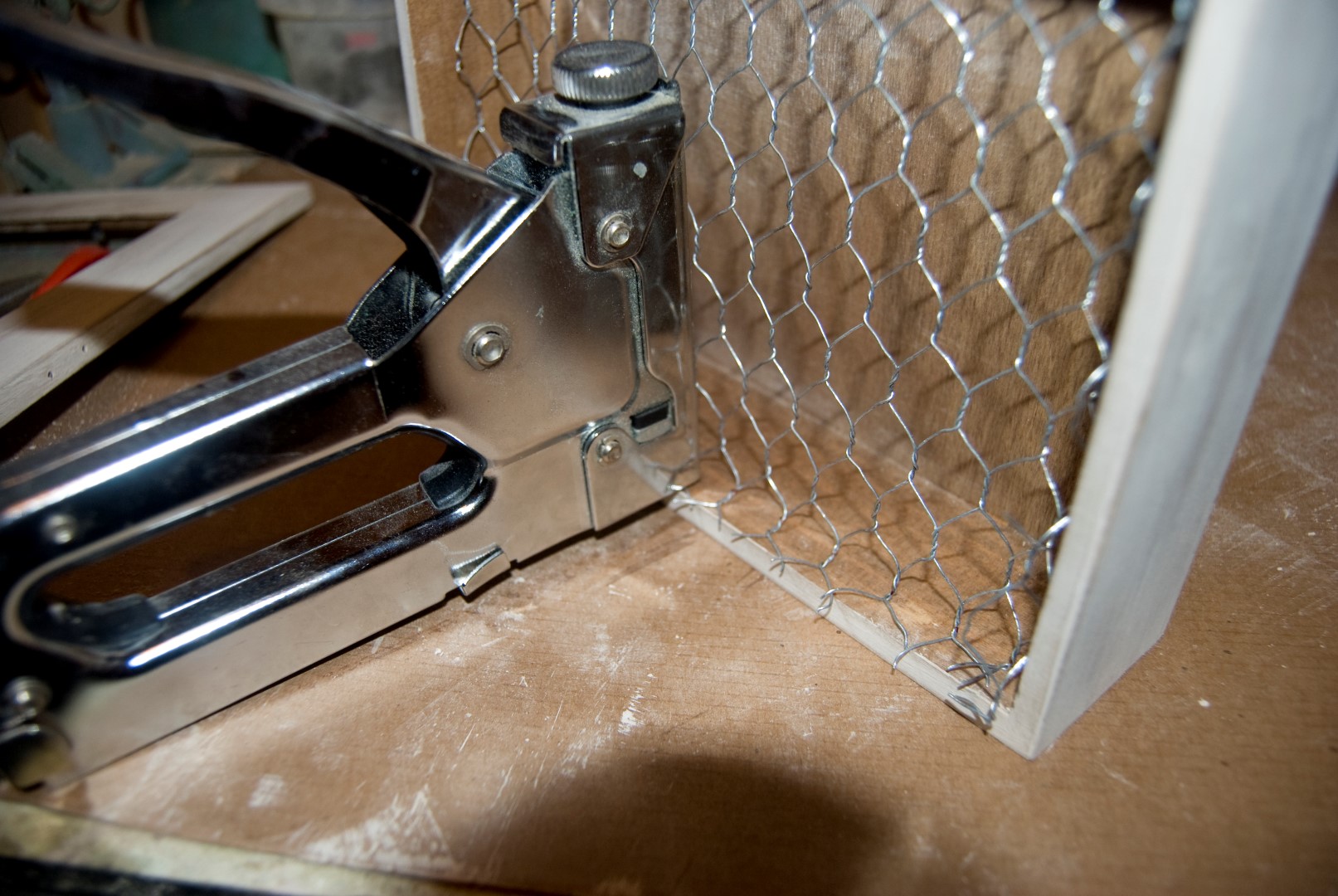 Ahora podemos colocar definitivamente la rejilla en su sitio, y la sujetamos con la grapadora. Un par de grapas por cada lado bastarán.