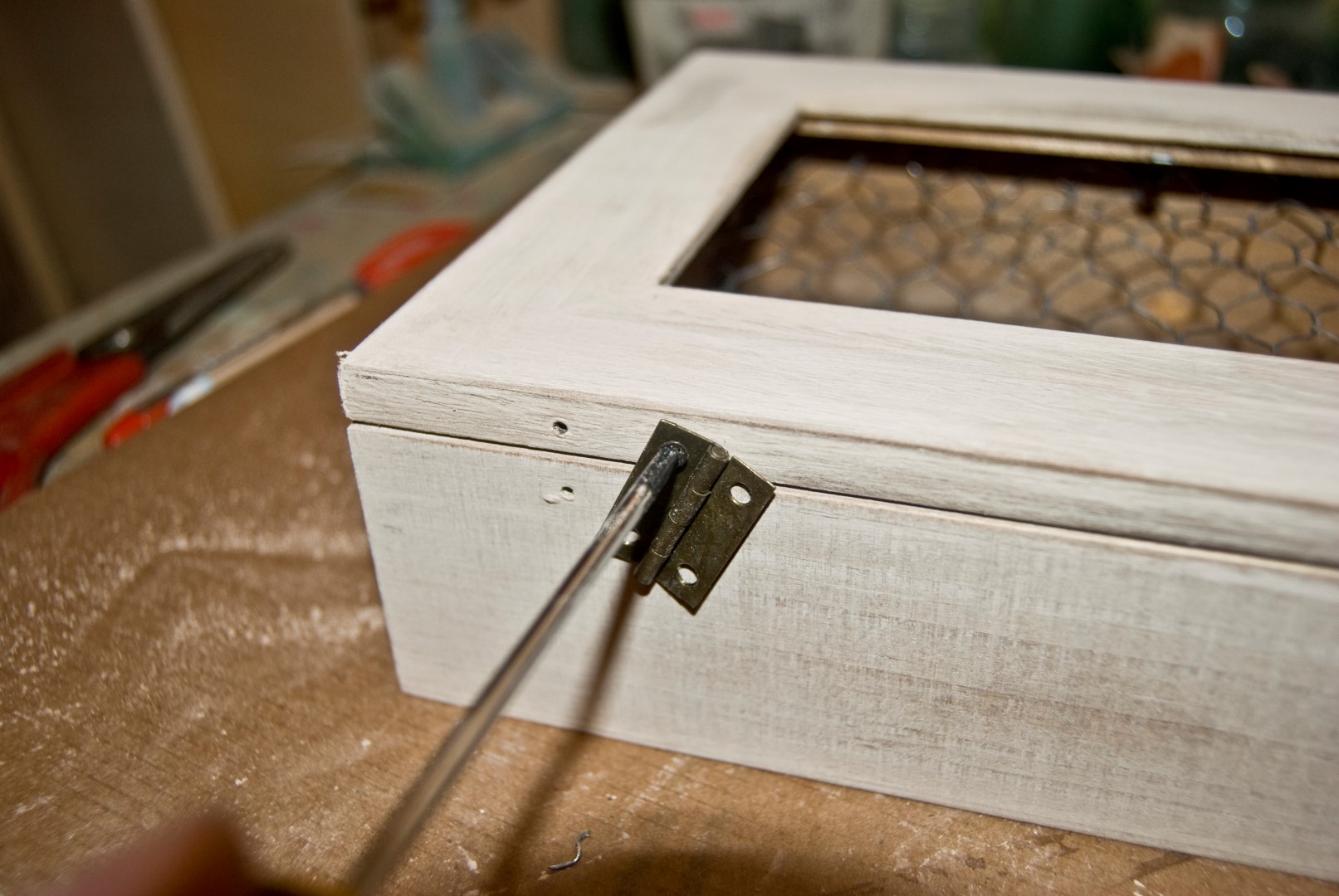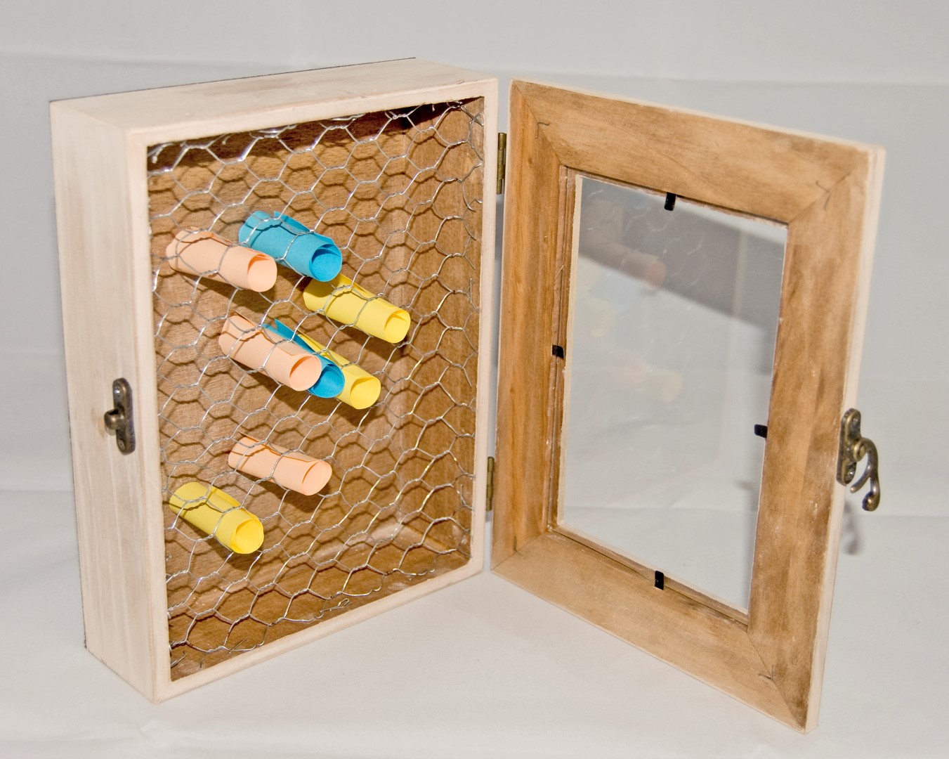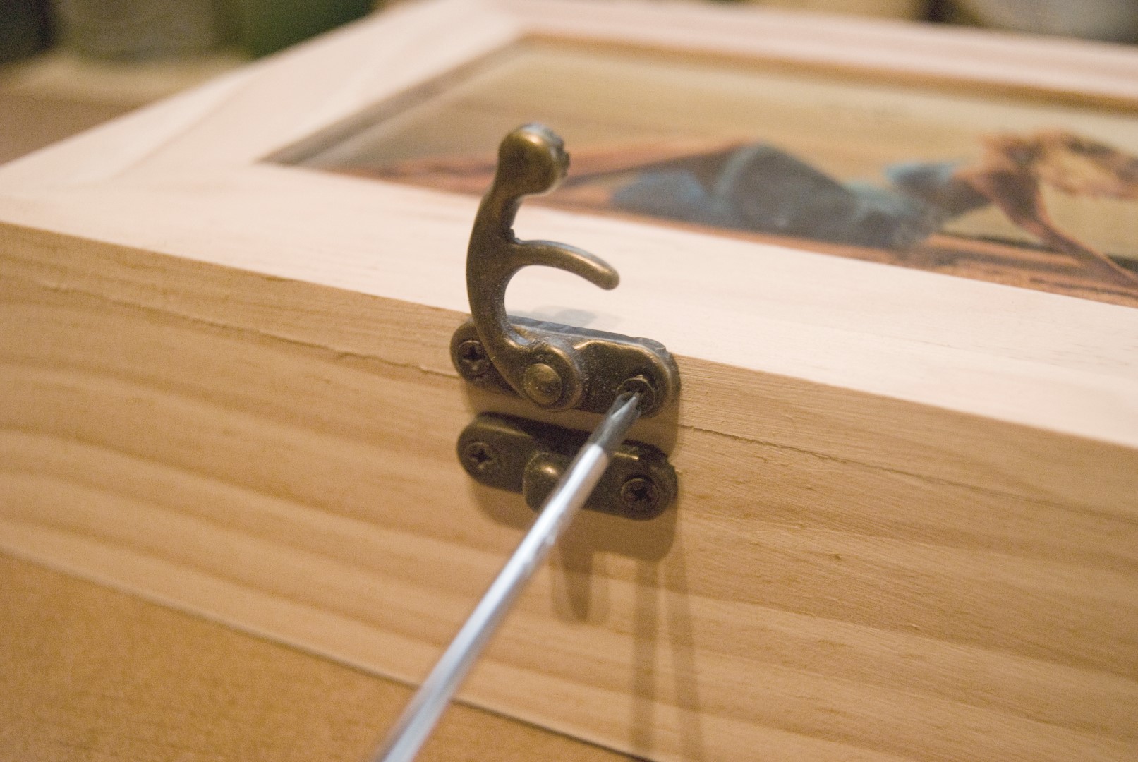 Volvemos a montar la caja con sus bisagras, cierre y cristal. (sin la foto que traía).