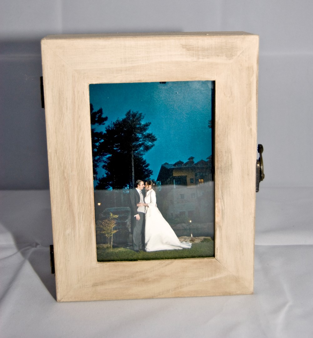 Podemos guardar la caja tal cual, para que se vean los rollitos por el cristal, o, una vez pasada la boda decorarla con una foto del gran día.