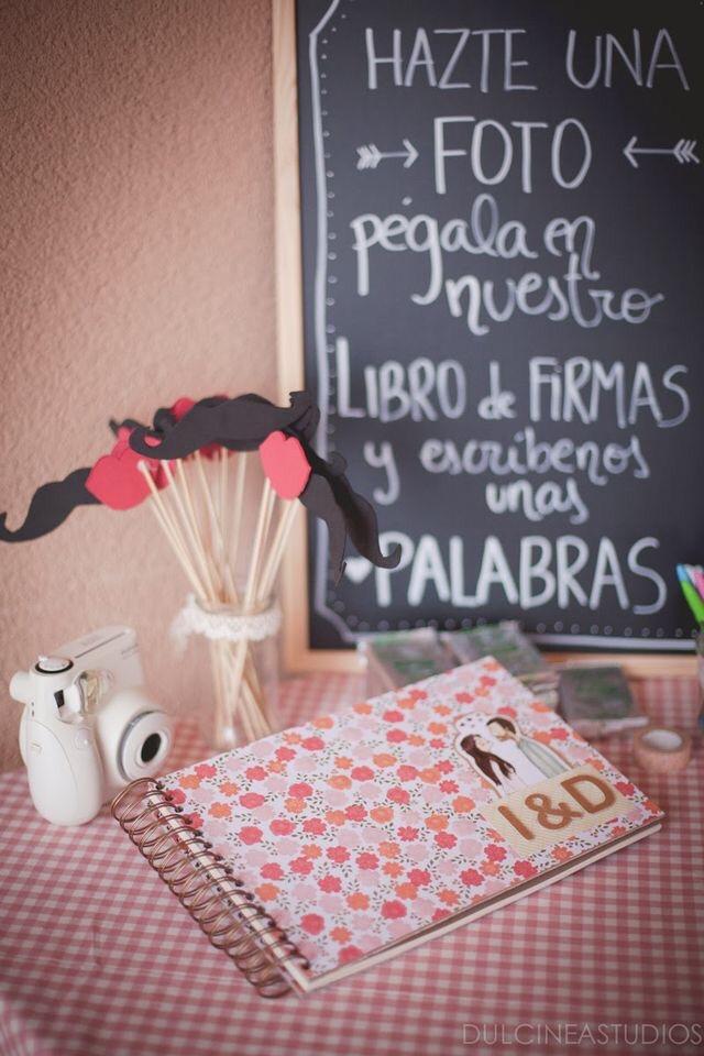 Podemos optar por el clásico libro de firmas pero dejando una cámara, que los invitados no sólo escriban sus palabras sino que peguen una foto instantánea de ese momento preciso.