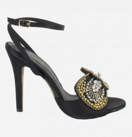 Sandalias de tacón alto y tiras, con detalles de pedrería dorada y perlada. Referencia