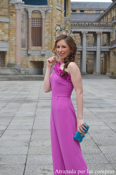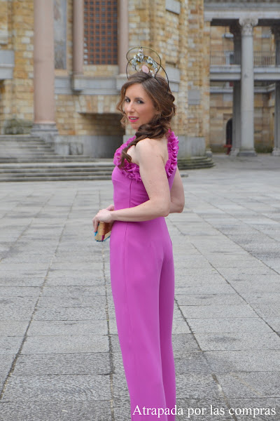 Para combinarlo tenía claro que quería que fuera con algo que rompiese esa estética romántica del tocado, así que recurrí a APPARENTIA, una firma de moda asturiana que se ha consolidado como una de las mejores alternativas a la hora de escoger el atuendo adecuado para un evento, y allí encontré el mono Alexis, confeccionado en crepe, de corte asimétrico, pantalón palazzo y color frambuesa.