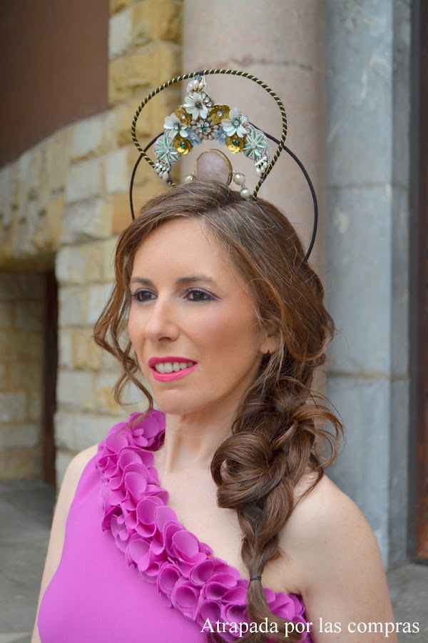 Un tocado de NOHEMÍ MAESTRE, (ya os hablé de ella en otro post que podéis volver a ver aquí) la primera vez que lo vi me pareció espectacular, una auténtica obra de arte, hecho a mano con flores de porcelana, lentejuelas y un cristal rosa central, diferente totalmente a los tocados que solemos ver y a mi eso es me encanta.