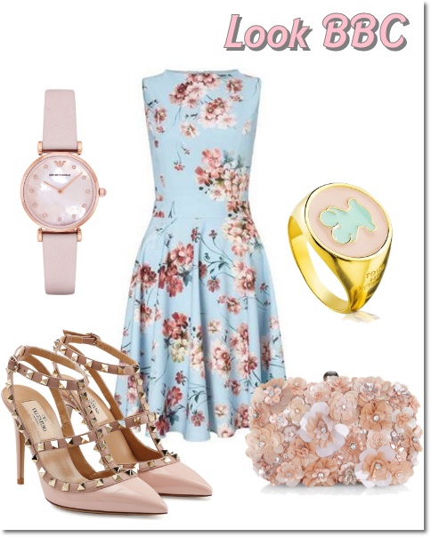 Reloj de Emporio Armani (250€), vestido de Miss Selfridge (70€), anillo de Tous (110€), zapatos Rockstud de Valentino (785 € aprox.), clutch de flores y pailletes de Accesorize (78€).