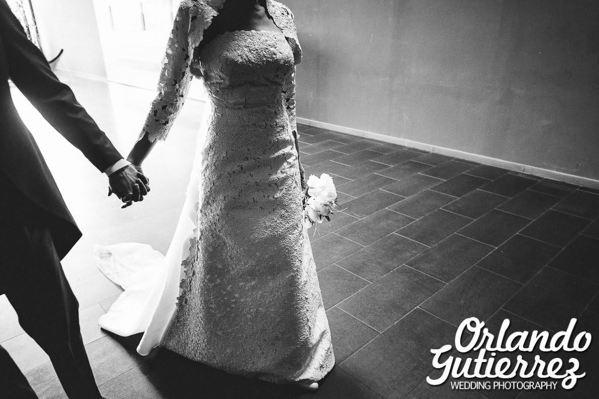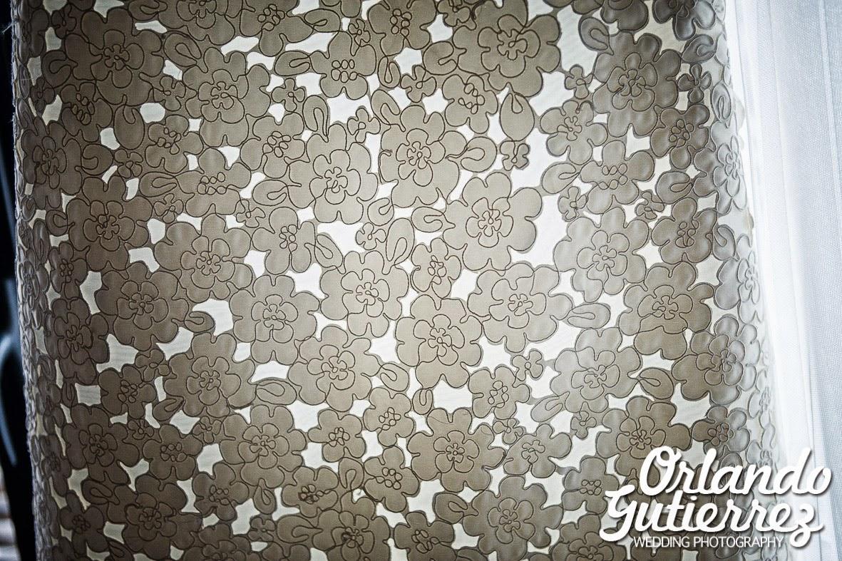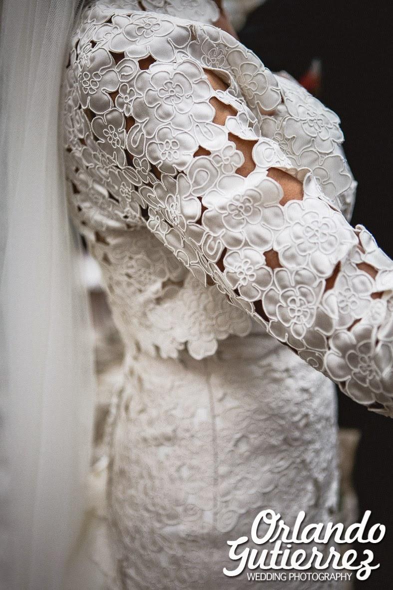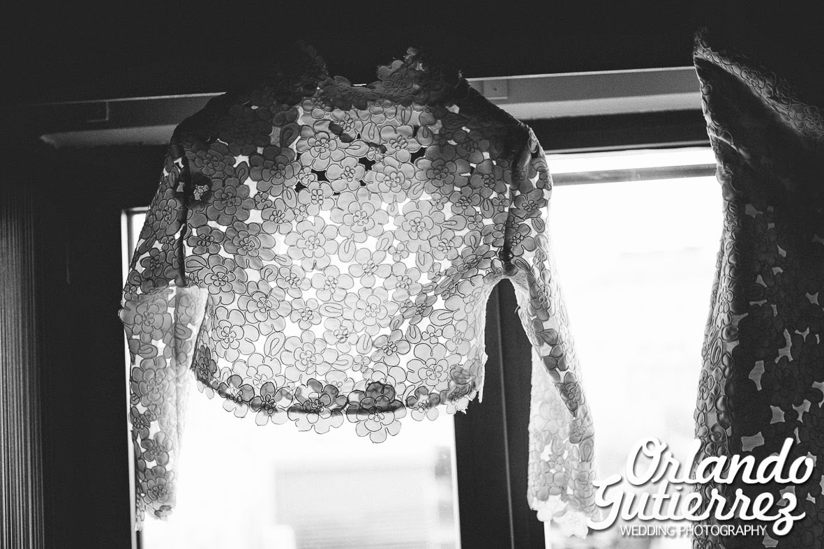 A continuación el protagonista principal del look de la novia, el vestido, diseño de Hannibal Laguna. De los vestidos más bonitos y originales de novia que he visto, teniendo en cuenta que cada vez me gusta más el guipur. Un vestido con escote palabra de honor y cuerpo ceñido con una cola muy original de seda que se abre paso a través del guipur y contrasta con el resto del vestido. Como la boda fue en abril y todavía hacía fresquito, de hecho ¡nevó durante el banquete!, llevó un bolero a juego. Viendo la importancia del labrado de la tela del vestido, era necesario que los complementos fueran sencillos para dejar el protagonismo a esa tela tan espectacular. Podéis observar todos estos detalles en las siguientes fotografías.