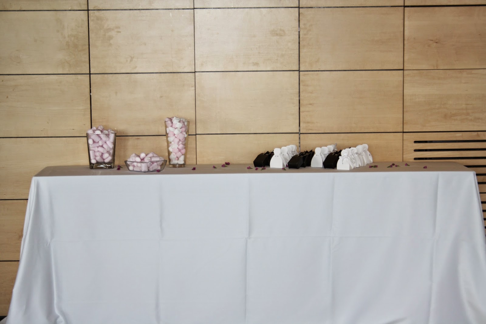 Además, a la llegada había pashminas para las invitadas que las quisieran, que por cierto, eran las mismas que regalamos en mi boda, y una mesa dulce con nubes y estos paquetitos tan monos en forma de novia y novio con bombones dentro.