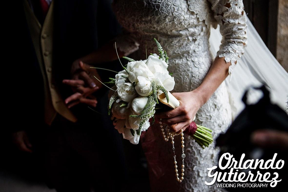El ramo de peonías blancas completaba el look de la novia, decorando su tallo con rafia color vino y detalles personales de la novia como un rosario.