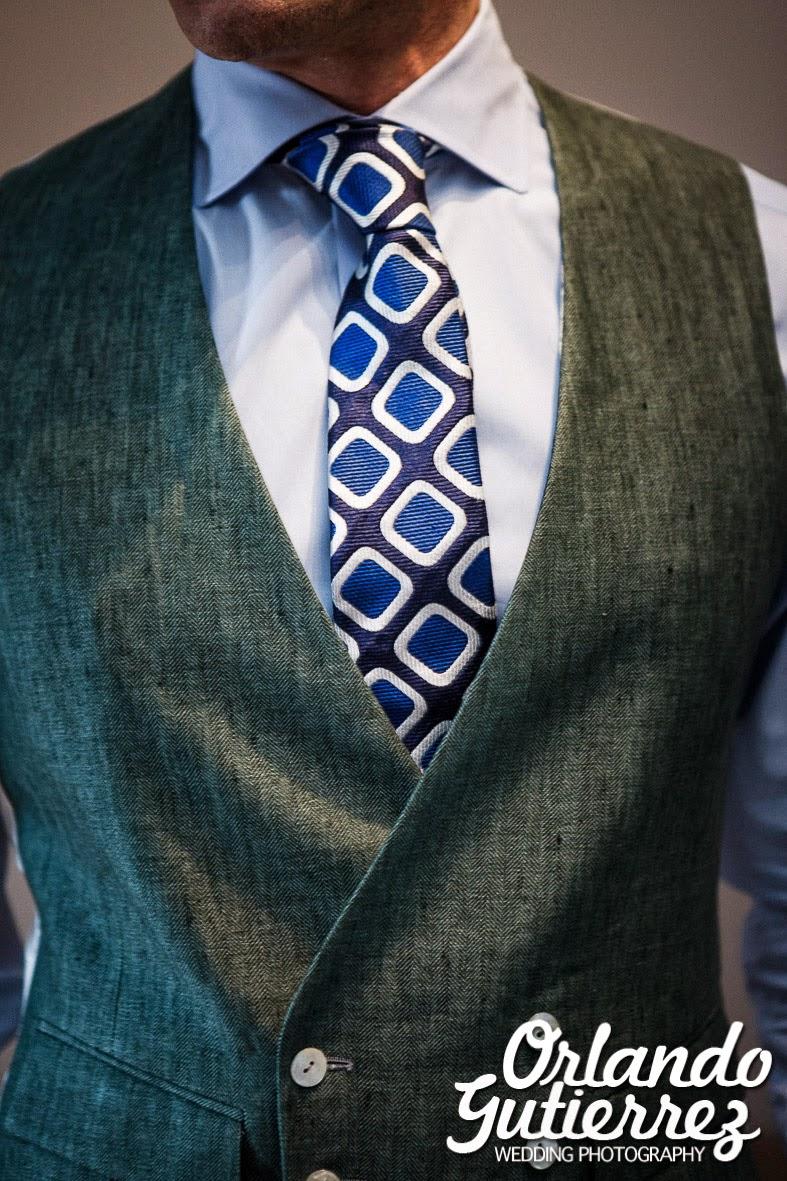 Ahora le toca el turno al novio. Escogió un chaqué gris para la ocasión que combinó con un chaleco verde y una corbata con tonos azules. Además, en la siguiente fotografía podéis observar los gemelos y el reloj que completaban su look.