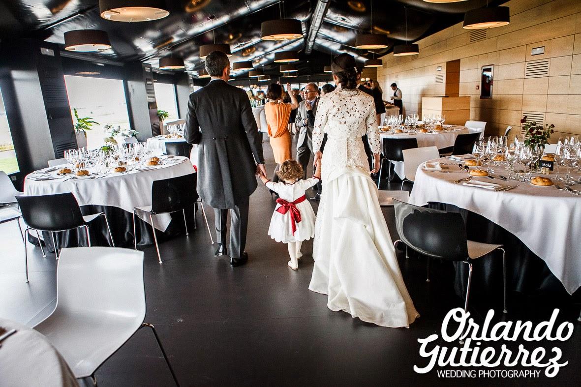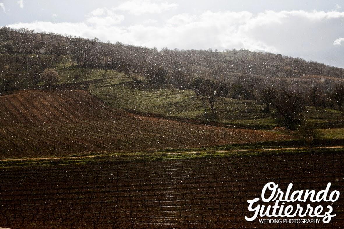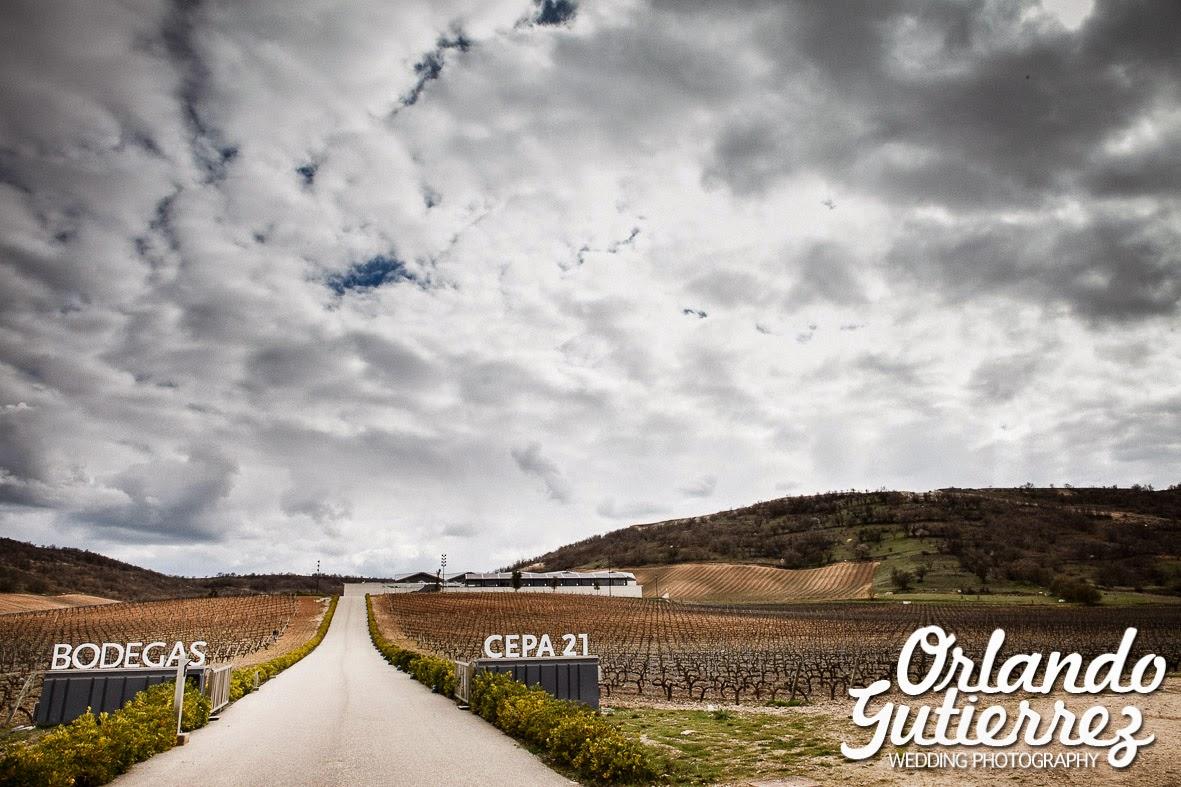 La celebración del banquete tuvo tuvo lugar en la Bodega CEPA 21, en Castrillo del Duero (Valladolid) a unos 8 km de Peñafiel. El salón del banquete estaba completamente rodeado de cristalera con vistas a los viñedos. El momento en el que se puso a nevar sobre el campo y poder admirarlo mientras comíamos a través de los grandes ventanales del salón fue totalmente mágico.