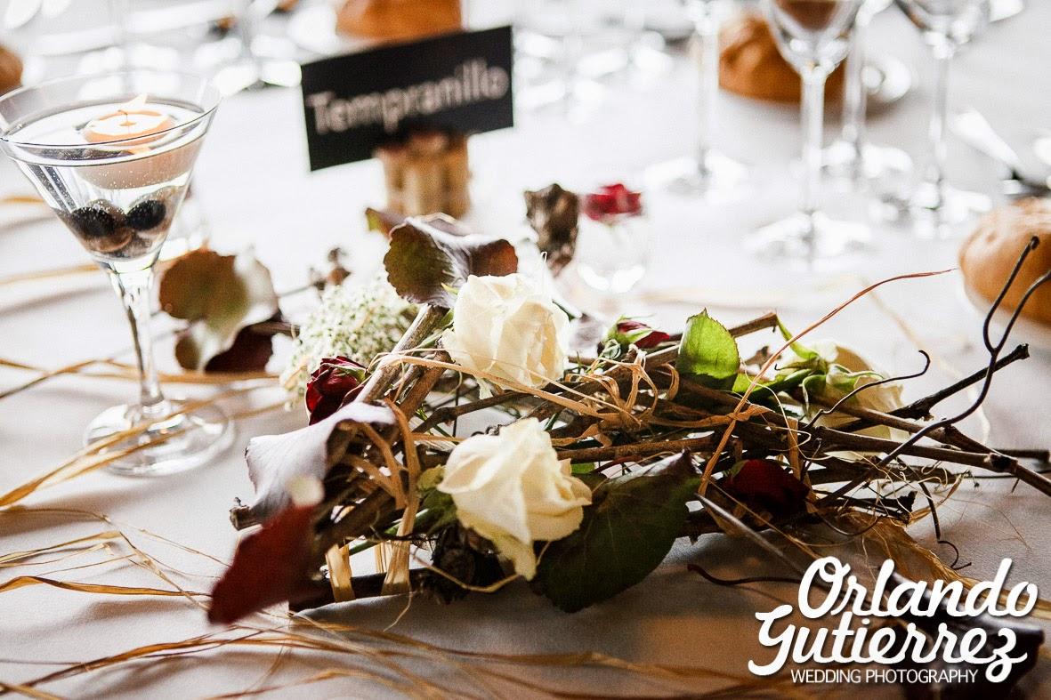 Las mesas tenían nombres de tipos de uva y decoración rústica con ramas secas, rosas y velas flotando en copas de cristal. El soporte de los meseros eran tapones de corcho de botellas de vino.