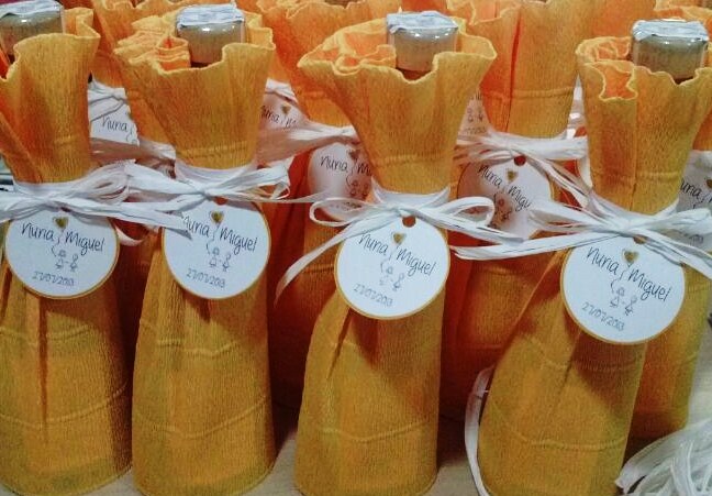 Mi padre, el padrino, fue el encargado de mirar los detalles de los hombres, pensamos en varios tipos de regalos, pero al final nos decidimos por un licor. En nuestro caso decidimos regalar un herbero de la Sierra de Mariola, una bebida típica del interior de la Comunidad Valenciana. Para el licor confiamos en Charo de Fiesta, Detalles e Invitaciones. Una tarde de sábado nos acercamos a Onteniente y allí quedamos con ella y decidimos el tipo de botella, las cantidades y el envoltorio.