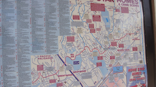 Beverly Hills, increíble, y como no llevábamos mapa paramos a comprarle uno a la primera mujer que vimos, si si, encontraras gente que los vende allí mismo pero a unos precios de locura y justo... un bus guía.