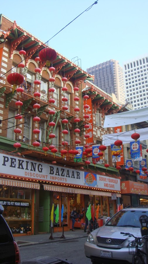 Cuando salimos del tranvía empezamos a andar calle abajo (Broadway Street) y empezamos a cruzarnos un chino, otro, otro mas... hasta que llega un momento que no hay ni un americano, increíble, no os imaginéis el Chinatown de Londres... para nada, esto es un barrio gigante donde todo es territorio chino, es una pasada, es como estar en Shanghái, o eso creemos, los faroles rojos, las banderas, todo escrito en chino... (muy diferente)