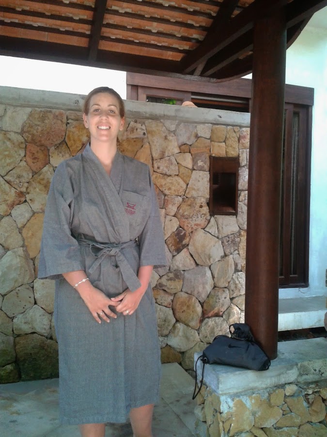 - Baño termal. En primer lugar, os recomiendo que disfrutéis de un baño relajante de cañas de azúcar, cítricos y menta. Ya sea porque el día anterior nos quemamos, estábamos a más de 30 grados o porque el agua estaba ardiendo nos costó muchísimo sumergirnos dentro. Es más aún recuerdo algunas anécdotas al más puro estilo Paco Martinez Soria. Igual que también recuerdo que estuvimos a punto de desistir y no sumergirnos en el agua. Pero tenéis que hacerlo. Los músculos se relajan muchisimo, se preparan para el masaje, y si, además disfrutáis del baño, en un entorno como el nuestro, sin duda, ese primer paso se convierte en un paso esencial antes de ponerte en manos de la masajista.