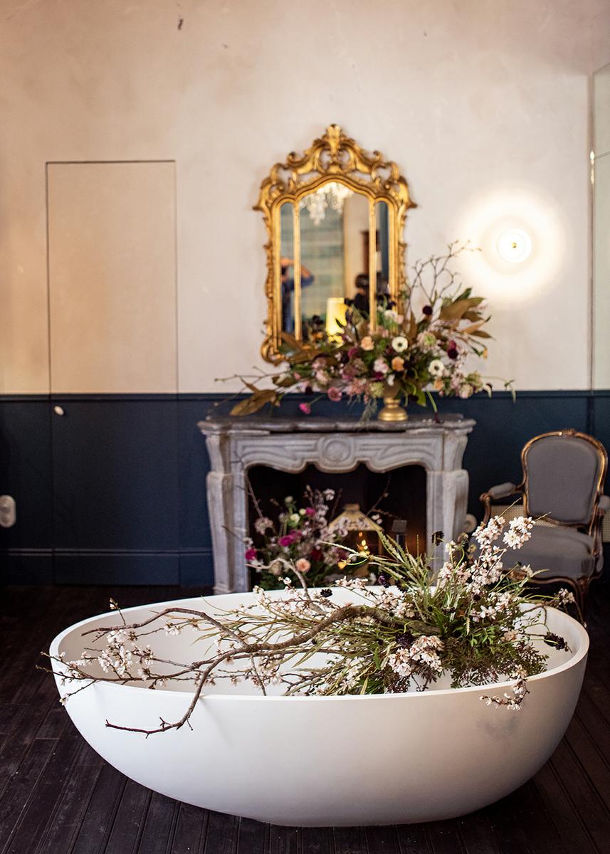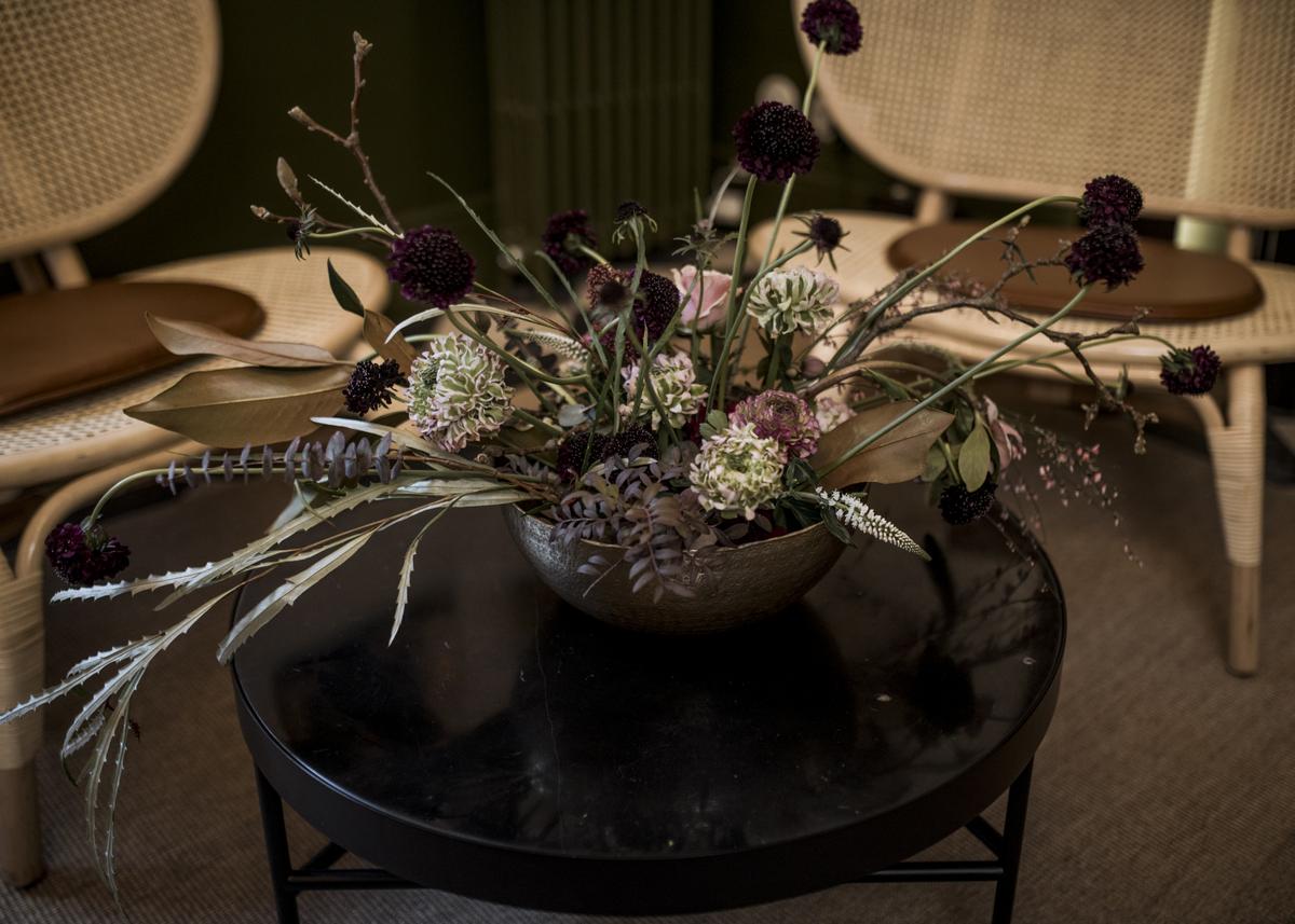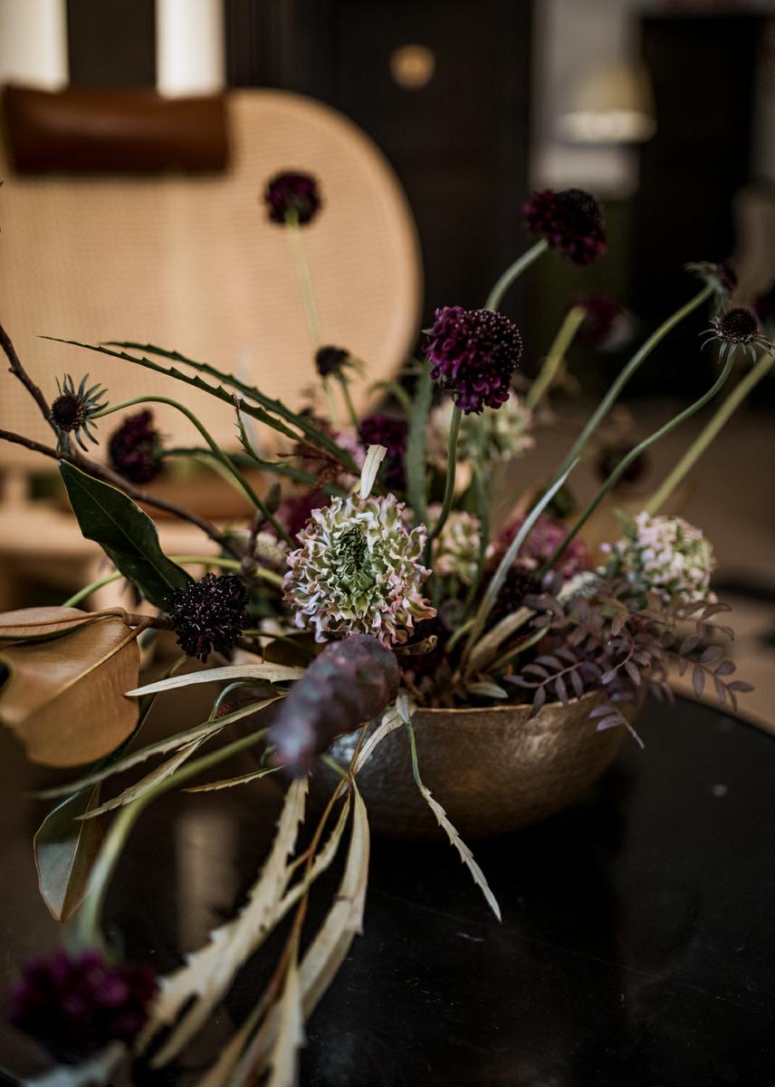 Las premisas que seguimos para esta decoración floral fueron, la integración tanto por colores como por estilo. Queríamos conseguir que diseño floral y interiorismo fueran de la misma mano. Por ello diseñamos tres arreglos florales de estilo romántico y decadente. Los colores debían ser discretos por ello apostamos por una paleta de color muy suave, tonos granates, berenjena oscuro y marrones. Para aportar luminosidad a los trabajos algunos pequeños toques de crema y melocotón terminaron la composición.