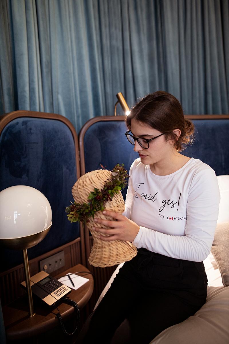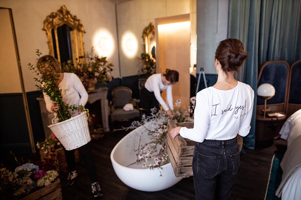 Este fue nuestro bello espacio asignado. Envueltas en telas de terciopelo turquesa se alzaba el telón para dar paso a nuestra puesta en escena. ¿Acaso existe un lugar más mágico que la habitación donde la novia se prepara para el día más importante? Invitamos a que la naturaleza tomase también su lugar dentro de ella en forma de originales arreglos florales que aportaran serenidad y paz para unos instantes tan especiales…Todo lo que aquí dentro iba a suceder tenía que estar en armonía.