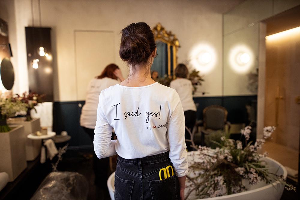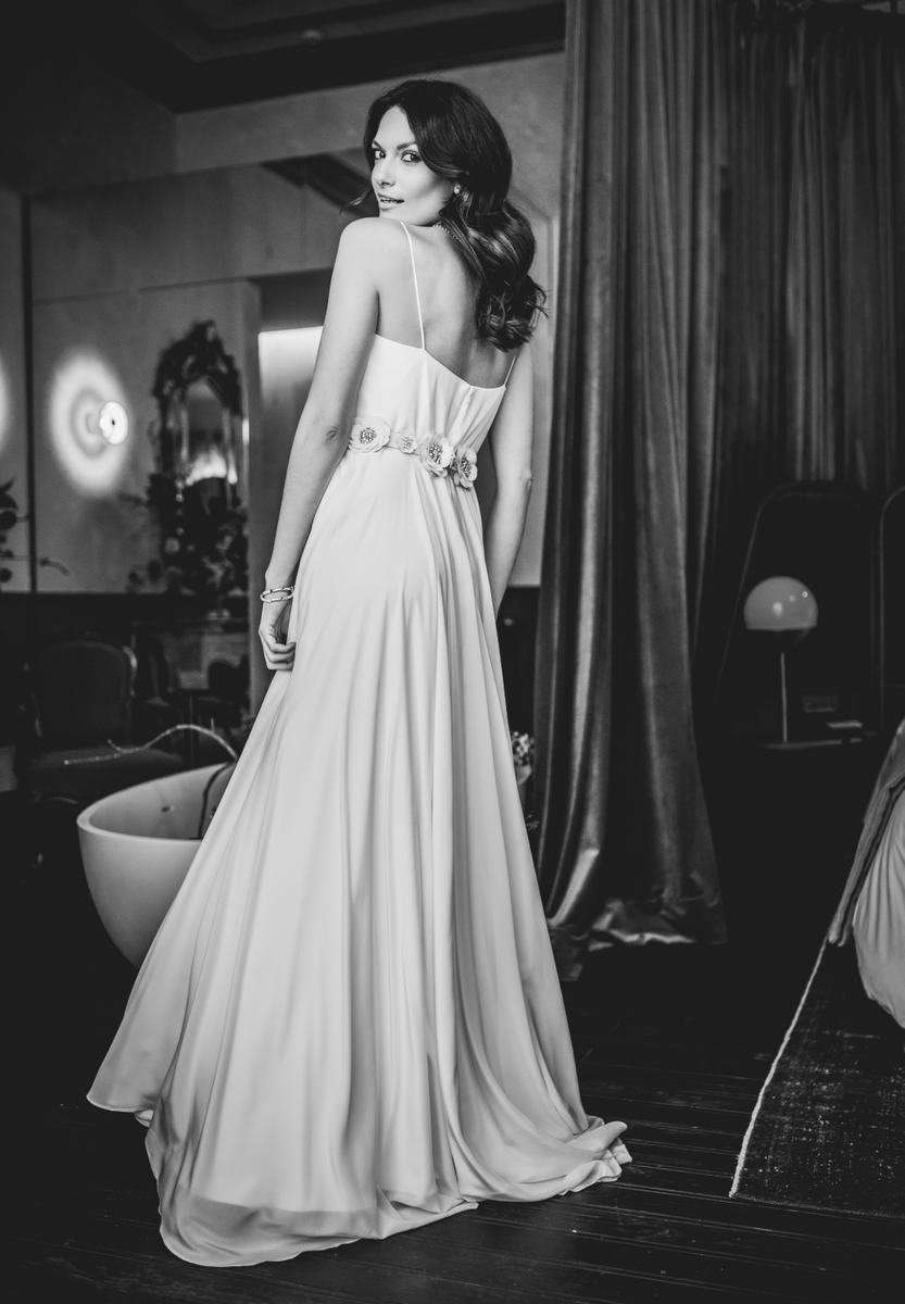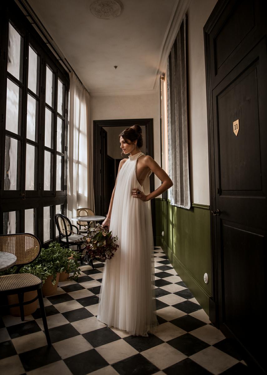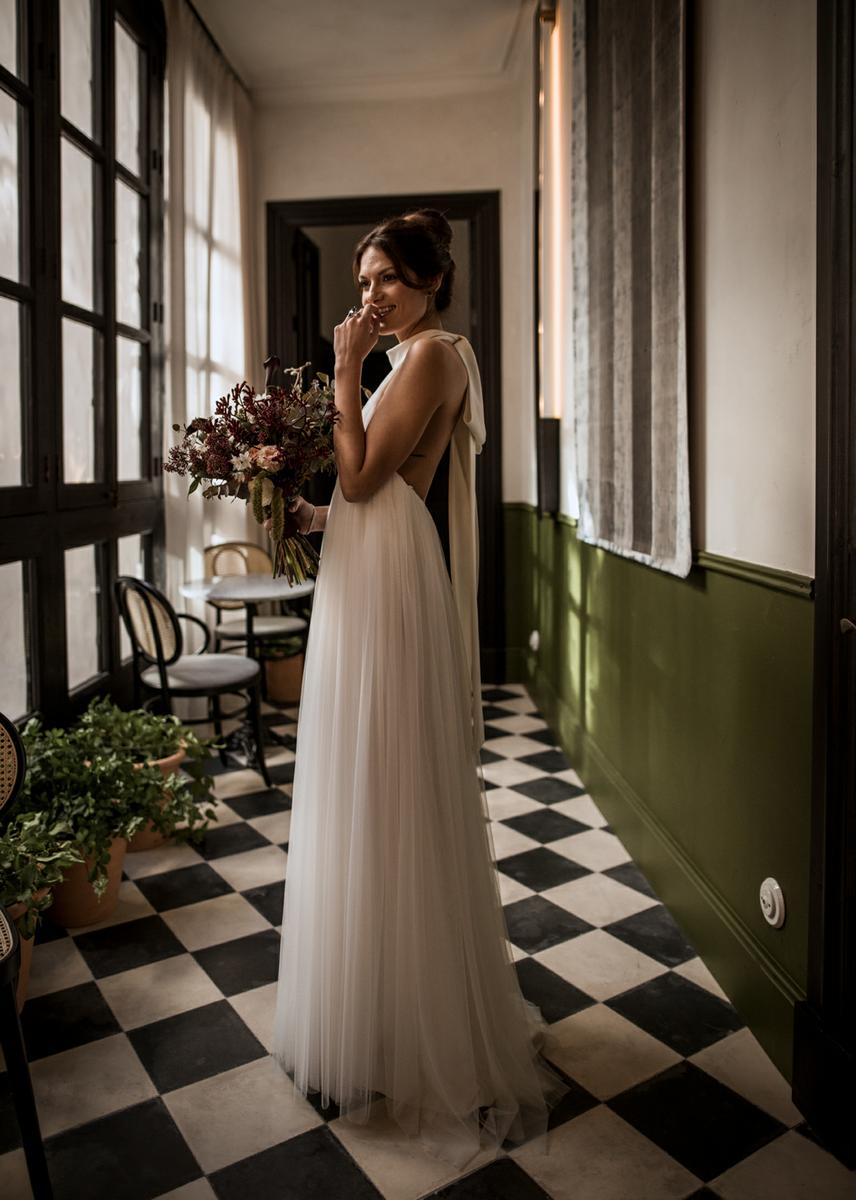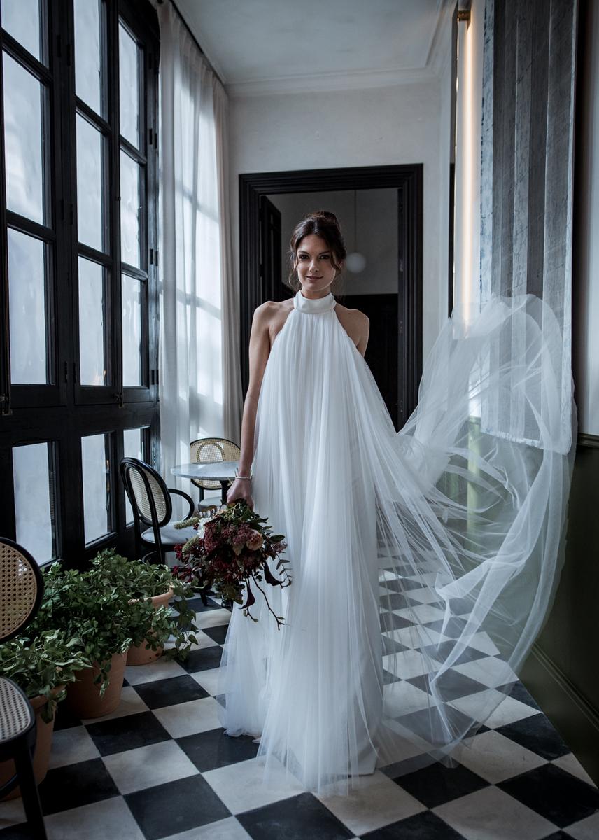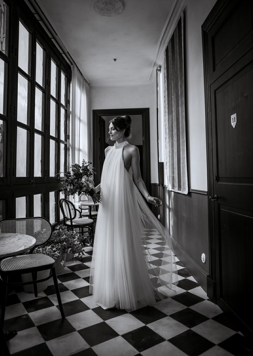 Sofisticación, sencillez, elegancia son algunos de los conceptos clave para este segundo look, acompañados de confort, ligereza y feminidad. El vestido de la marca española Sophie et Voilà es de tul con cuello halter en crêpe de seda y un enorme lazo anudado a la espalda. Un diseño de líneas relajadas, a la vez que lleno de fuerza y carácter.