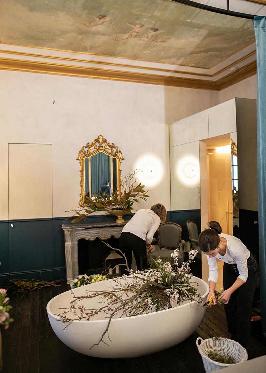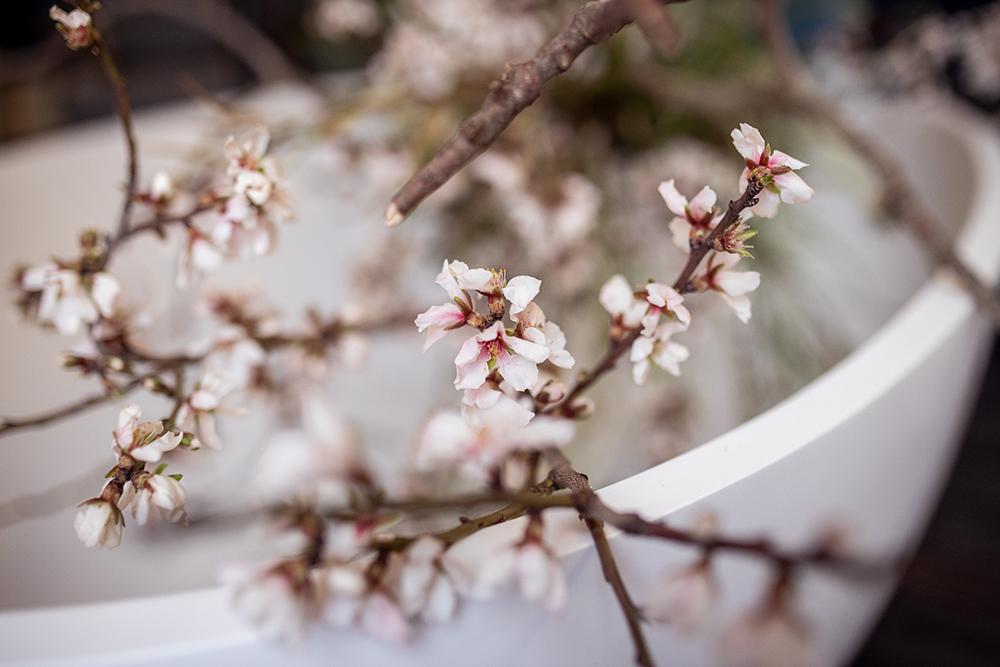 Flores: anemonas, anigozanthus, calas, dianthus, rosas de jardín, narcisos, papavers, ranúnculos, escabiosas, syringas y verónicas. Verdes: hojas de magnolio, ramas de cerezo, almendro y retama en flor y eucalipto.