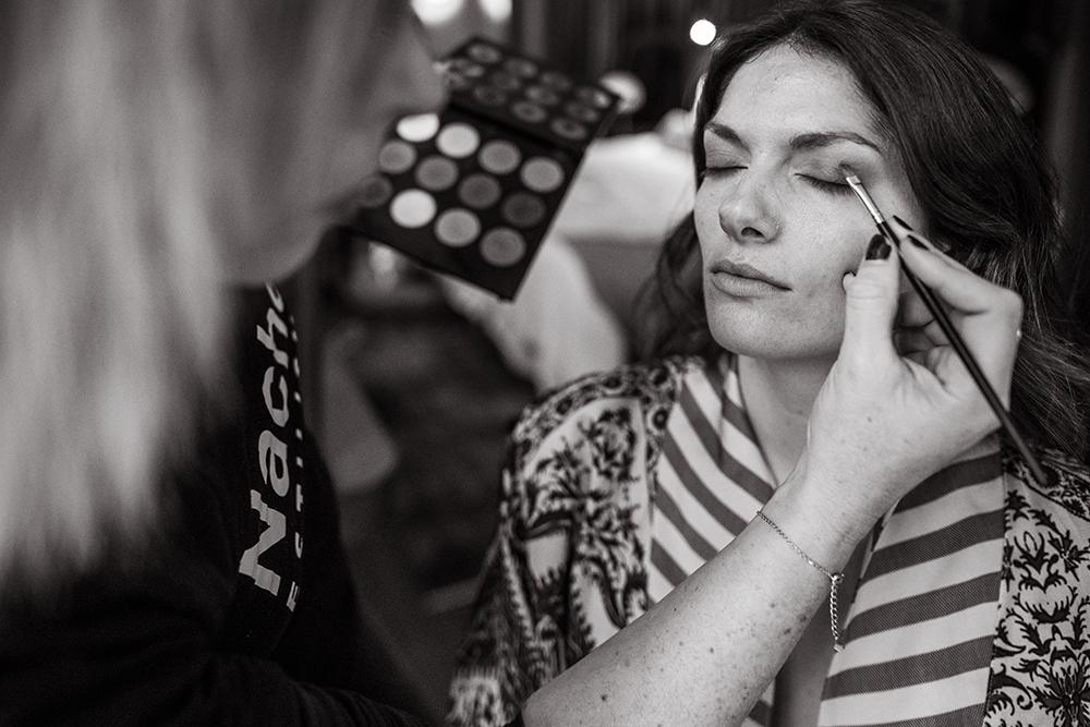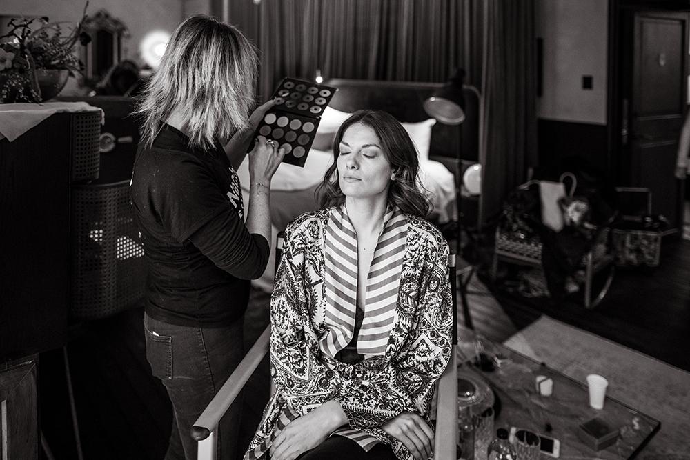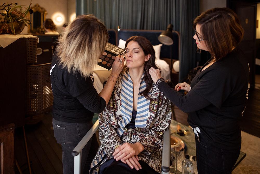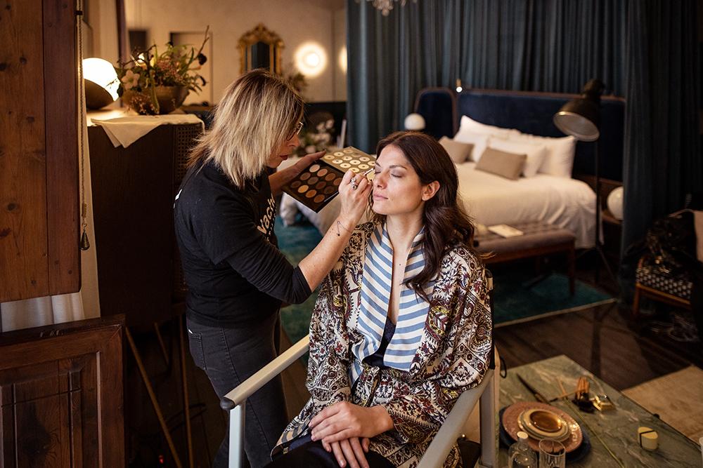 Para el maquillaje se apostó por una paleta de tonos fríos adecuada a su grupo de color. En los ojos sombras marrón, beige y un punto de plata, para los párpados fijo y móvil. Eyeliner y máscara de pestañas negro para aportarle mayor intensidad a su mirada. Se aplicó la base, ligera y natural aunque con una alta cobertura. Y tras las correcciones, polvo matizador y un punto sutil de iluminador. El siguiente paso fue elegir un blush de acabado mate tonalidad melocotón. Para los labios algo natural, ligeramente glowy.