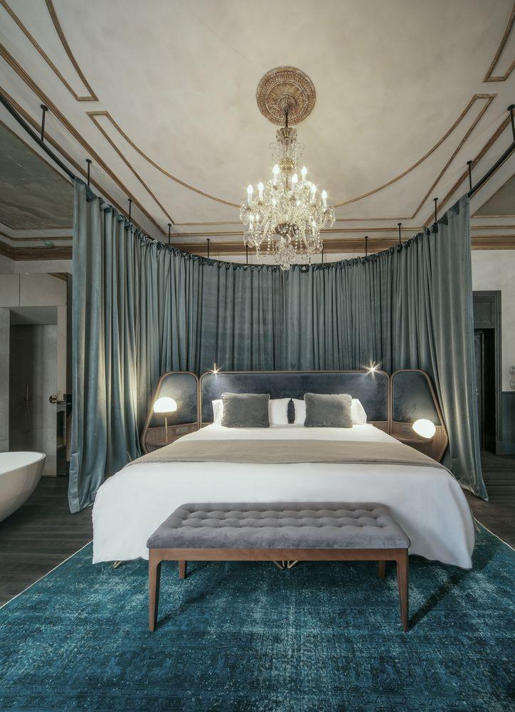 No lo dudamos ni un segundo, al ver la habitación sentimos que allí haríamos la intervención -shooting- . Un espacio amplio, continuo, de forma alarga, de línea recta y con el predominio del azul turquesa en las telas de terciopelo que lo visten, pasando a enfatizar aún más su grandeza. Te traslada al pasado, como si estuvieras dentro de la escena de un film, de un cuento, interpretando y acentuando la elegancia, el diseño. Eso es lo que nosotras queríamos transmitir con nuestra intervención, en el que el protagonista fuera la sensación de vivir por un momento en el pasado de la aristocracia mallorquina en un momento tan especial (el de la novia) y complementarlo o añadir un respiro natural, de color y de vida con nuestro diseño floral. Tanto el vestuario como los complementos iban acordes con la habitación. Resultó ser un mágico momento.