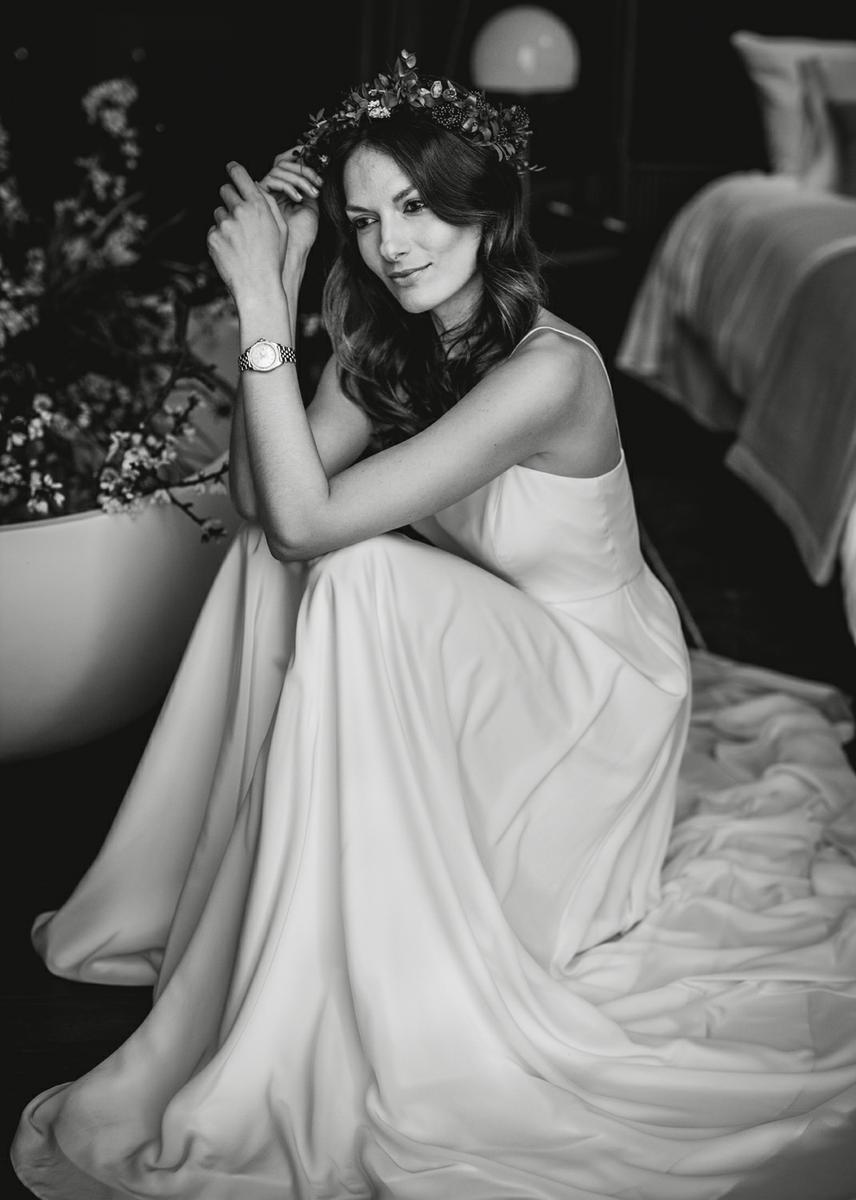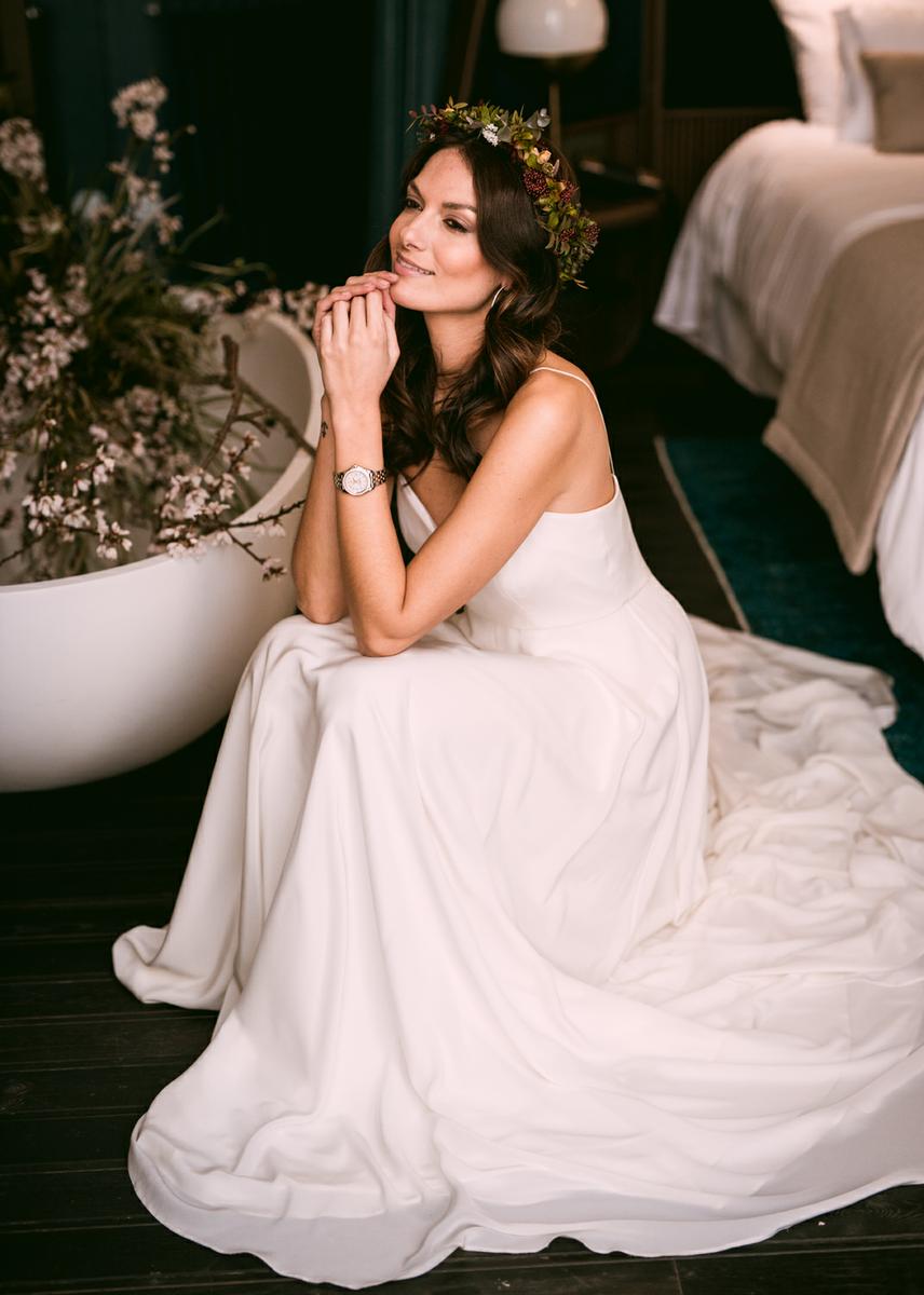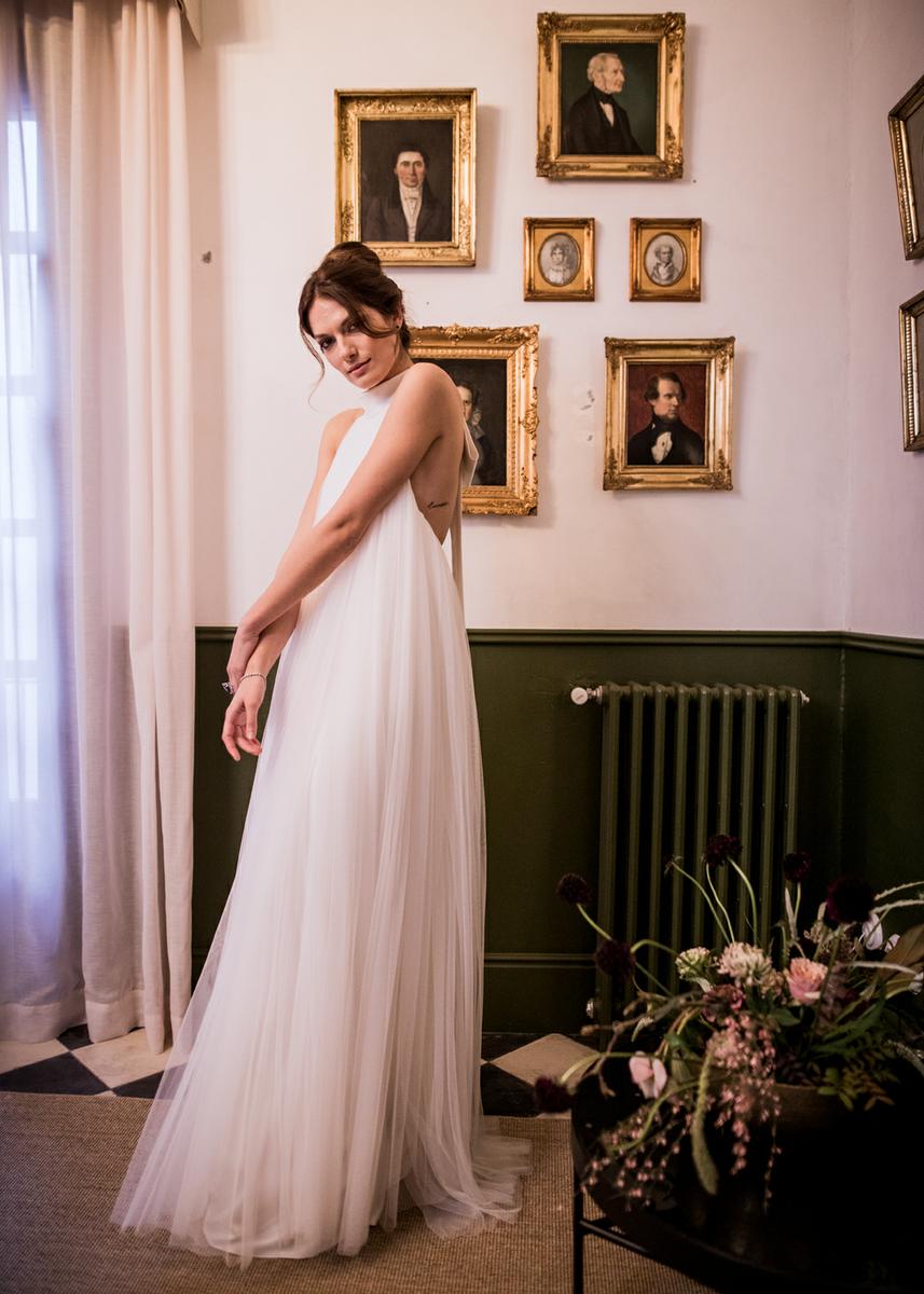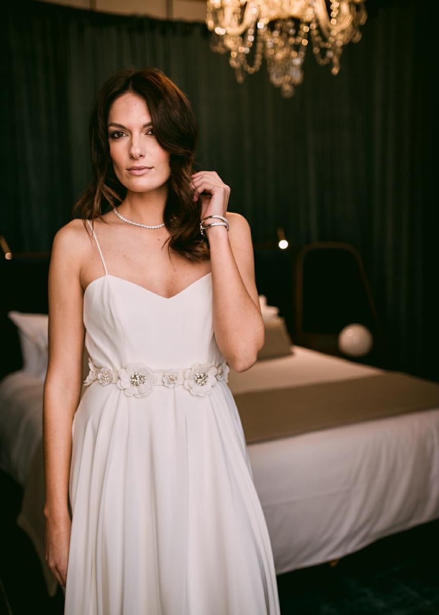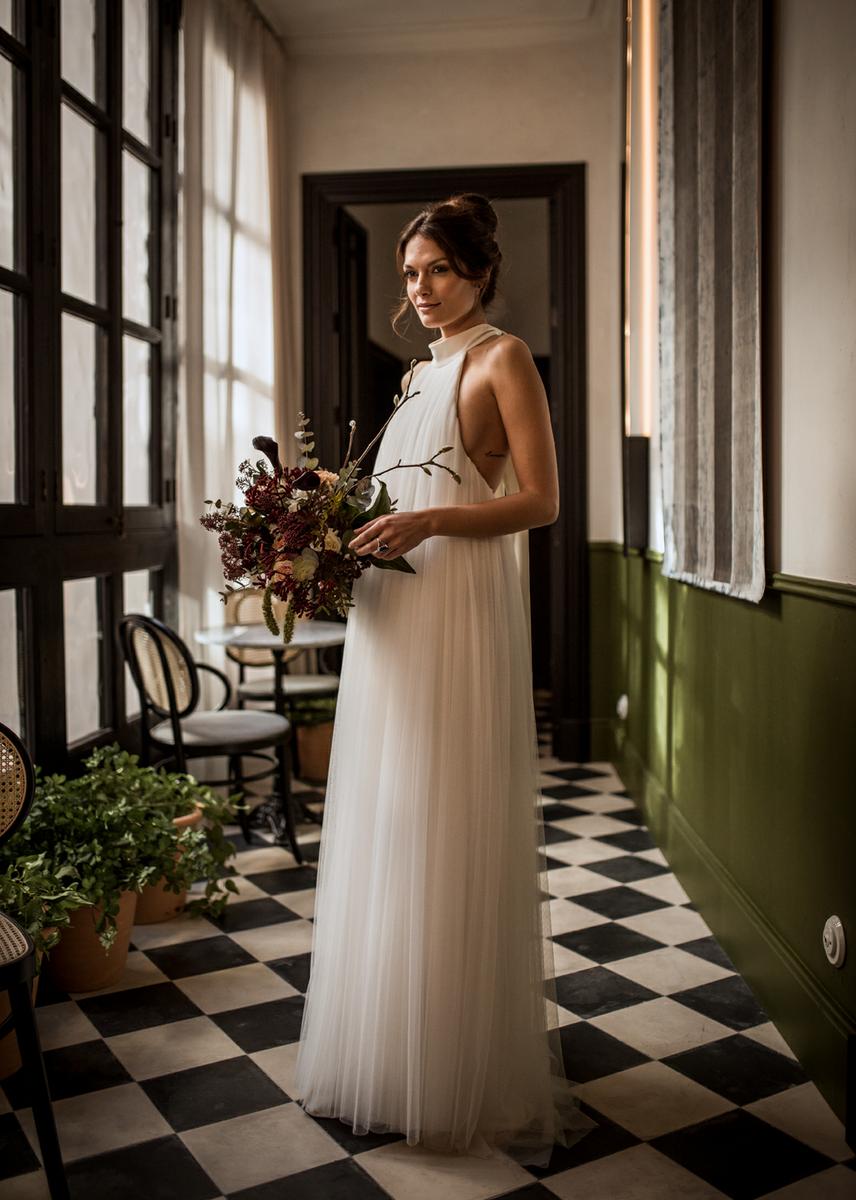 El estilo elegante y minimalista del vestido combina a la perfección con el aire sofisticado y sobrio del entorno. De la misma manera, la ligereza y calidad del tejido aporta frescura y comodidad, sin duda la mejor opción para novias que quieren sentirse femeninas y a gusto para disfrutar cada momento en su gran día.