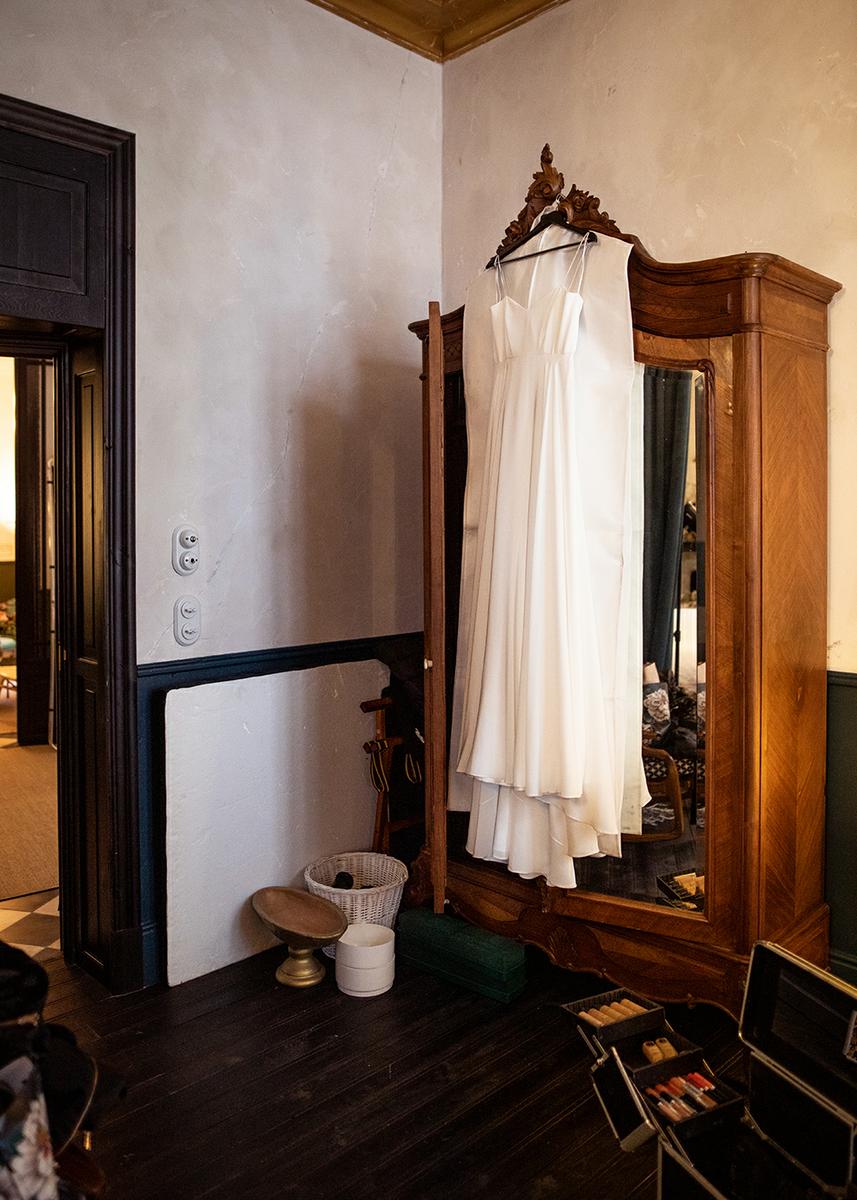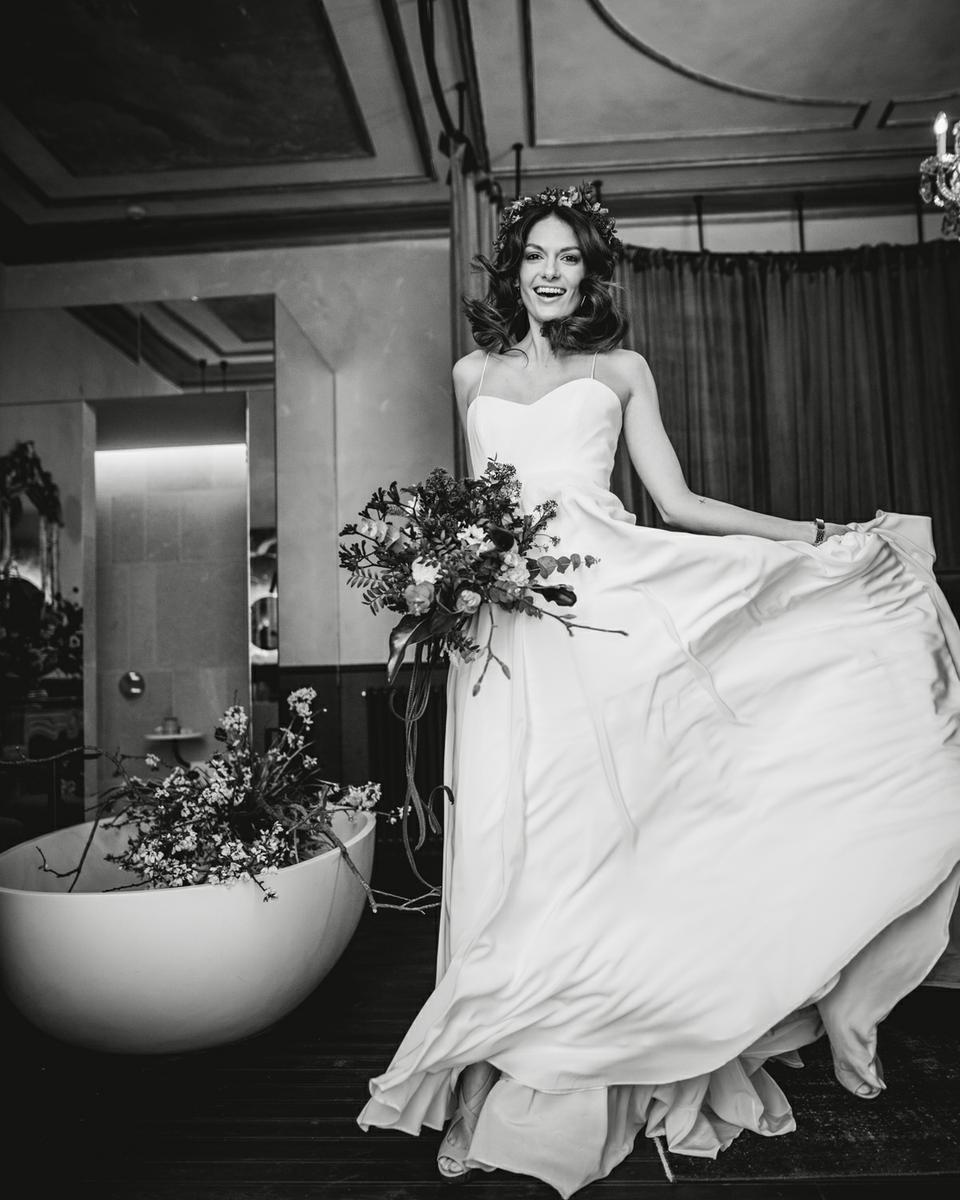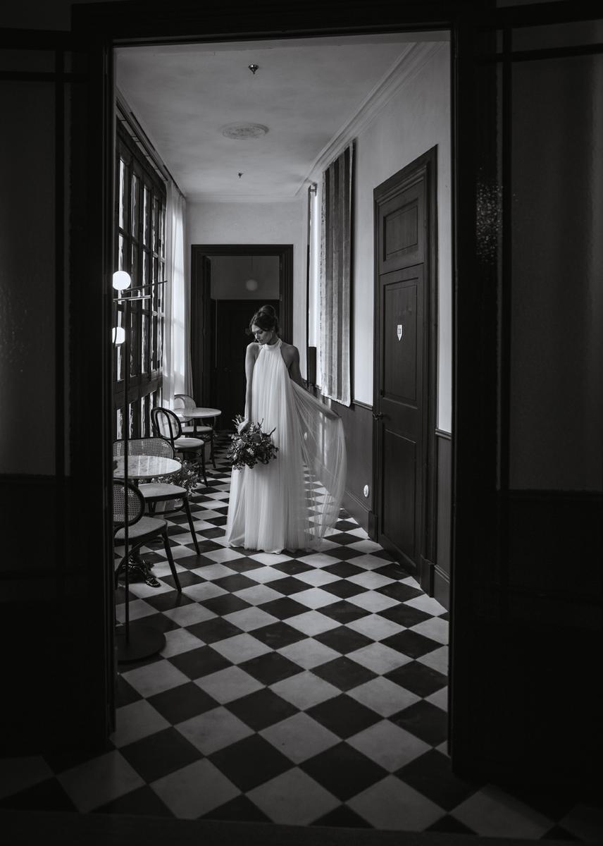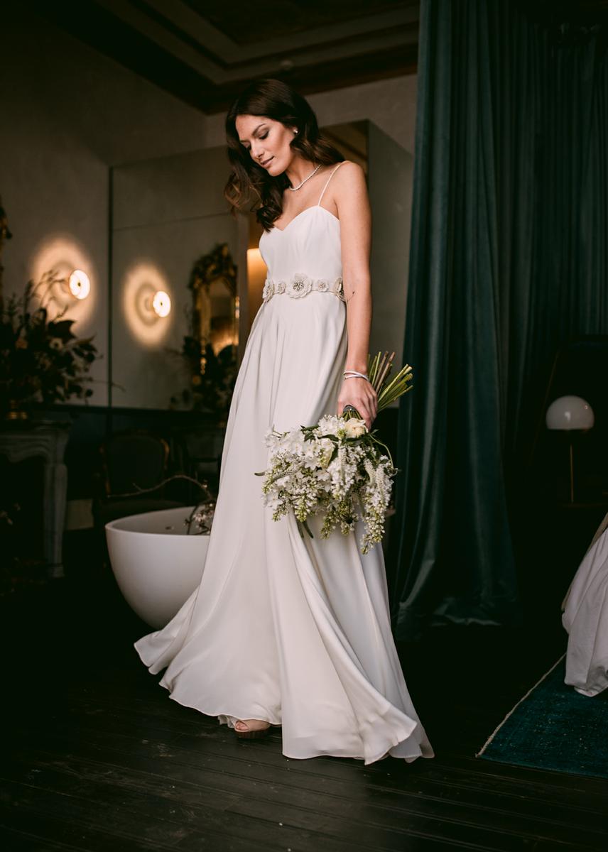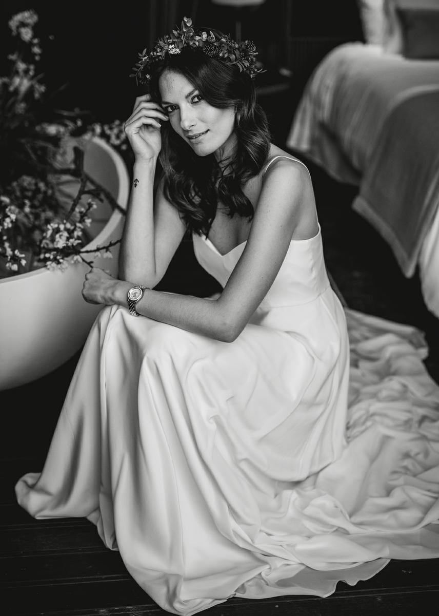 El estilo elegante y minimalista del vestido combina a la perfección con el aire sofisticado y sobrio del entorno. De la misma manera, la ligereza y calidad del tejido aporta frescura y comodidad, sin duda la mejor opción para novias que quieren sentirse femeninas y a gusto para disfrutar cada momento en su gran día.