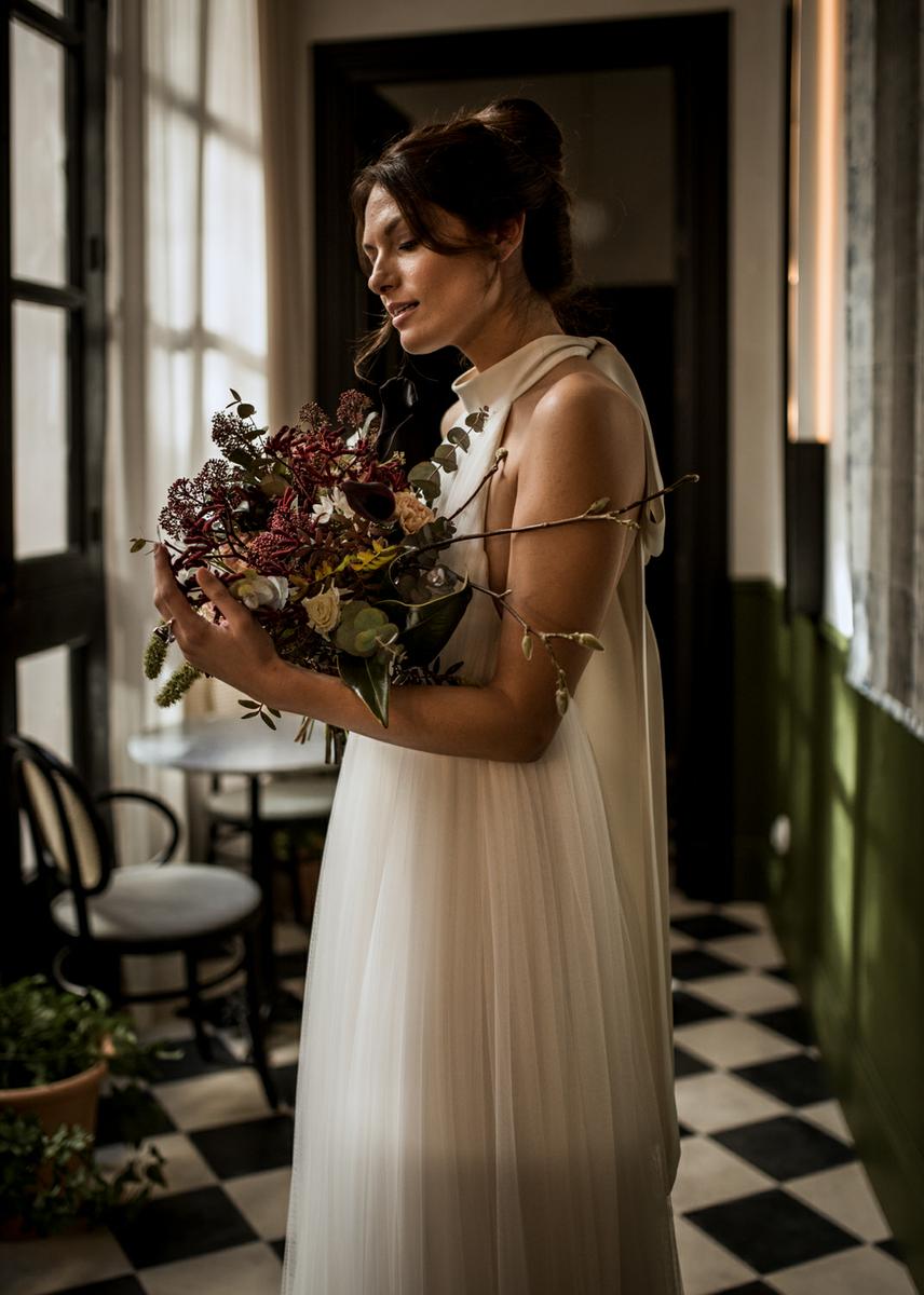 En este caso el ramo destacaba por la técnica de la desestructuración, cada elemento del mismo tiene su propia dirección sin por ello estorbarse los unos a los otros. Los materiales de diferentes texturas combinados, como ramas, verdes y flores de diferentes formas dan paso a este divertido ramo. Los colores oscuros y apagados no hacen más que hacer mucho más interesante el ramo.