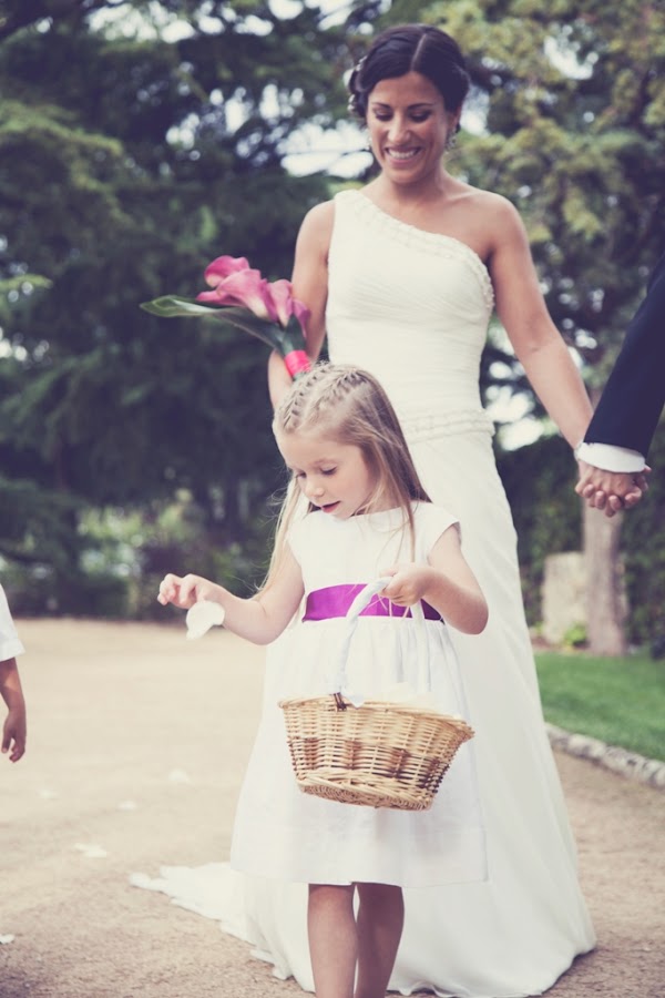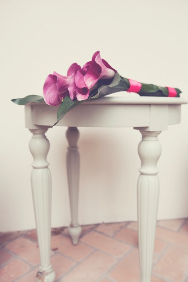 Para el ramo se decantó por unas calas fucsias (color junto con el morado predominante de la boda).