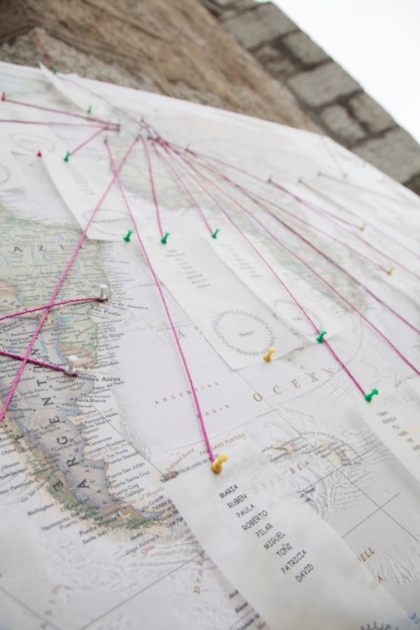 El banquete fue en el jardín de la finca, el seatting-plan era un mapa gigante y cada mesa el nombre de una de los ciudades del mundo que han visitado.
