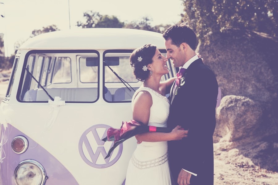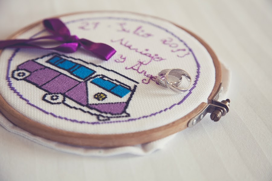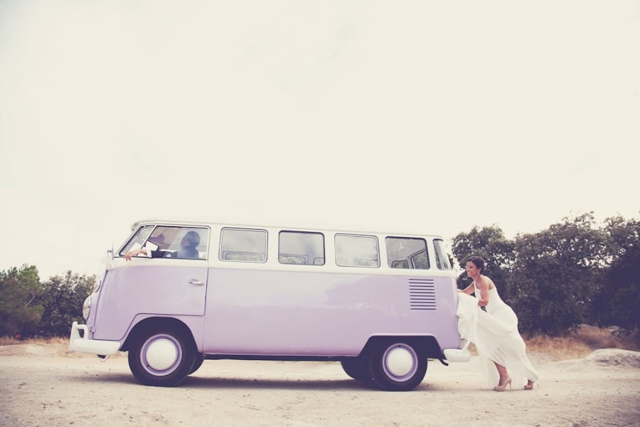 La ceremonia fue civil y un poco atípica, para empezar los novios llegaron juntos subidos en Angie, una furgoneta VW T1 violeta que daba el estilo vintage que les gustaba para su boda. Les acompañaban los sobrinos de Mariajo y la ahijada de Angel, vestidos de lino y con fajines/lazo morados. Se celebró al aire libre y las lecturas fueron la parte más emotiva de la boda, la amiga de Mariajo que les presentó, su hermana, su vecina, y sobre todo las palabras de Angel que hicieron a todos los invitados buscar clínex para secarse las lágrimas.