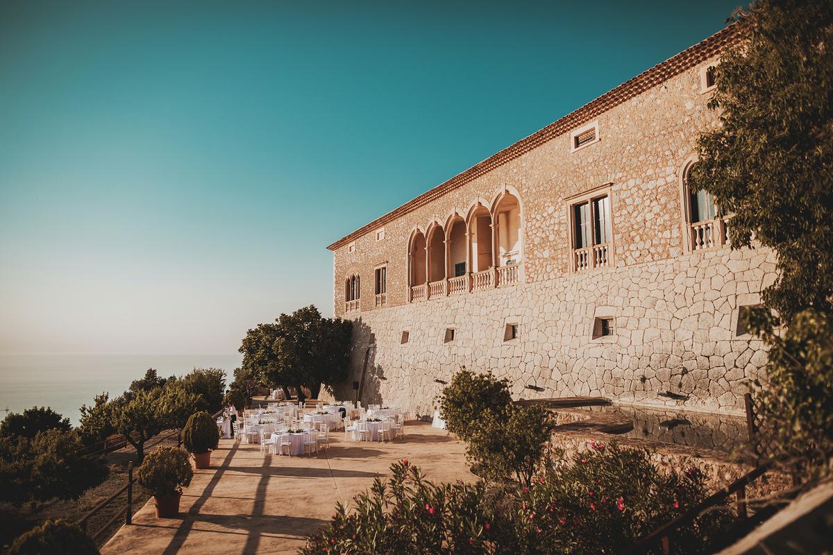 Se sirvió un welcome drink en la clastra para dar la bienvenida a los invitados. Este es uno de los detalles que más gustan ¡y más todavía en una tarde veraniega en Mallorca! Por eso mismo también colocamos sombreros colgados y abanicos en las sillas en la zona de la ceremonia para que todos ellos pudieran protegerse del sol y las altas temperaturas.